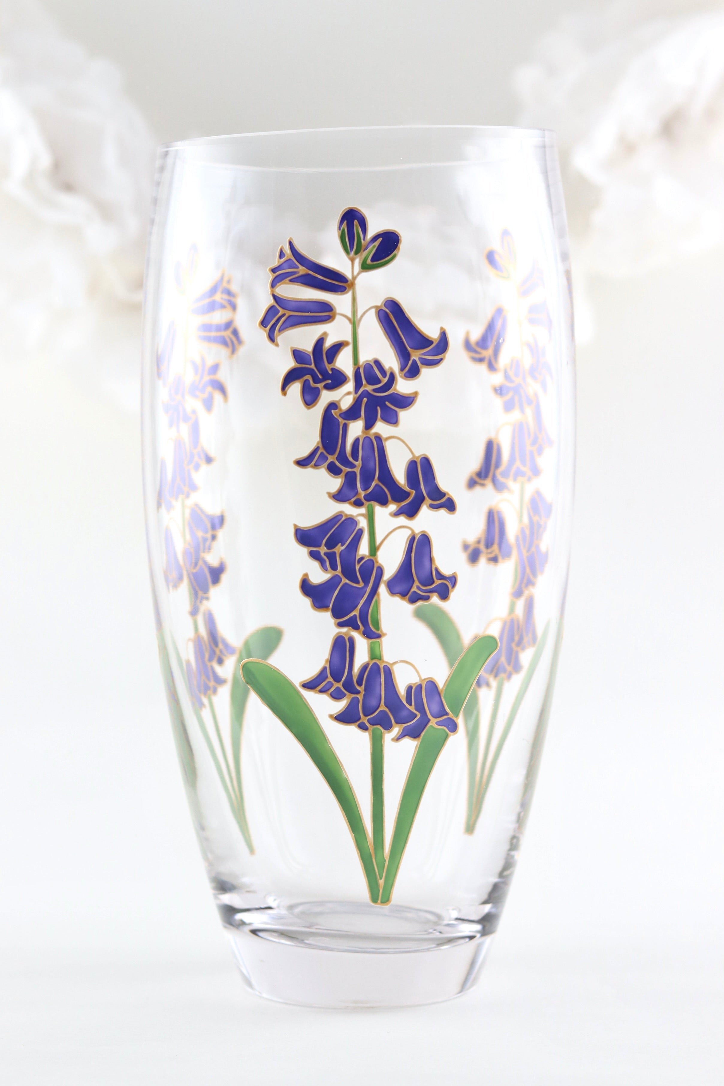 This beautiful, handmade, glass vase stands 25cm tall and measures approximately 12cm across the top. It is hand painted with a bluebell design in a gorgeous shade of deep, periwinkle blue and a paler green, outlined with gold, featuring three stems of bluebells.