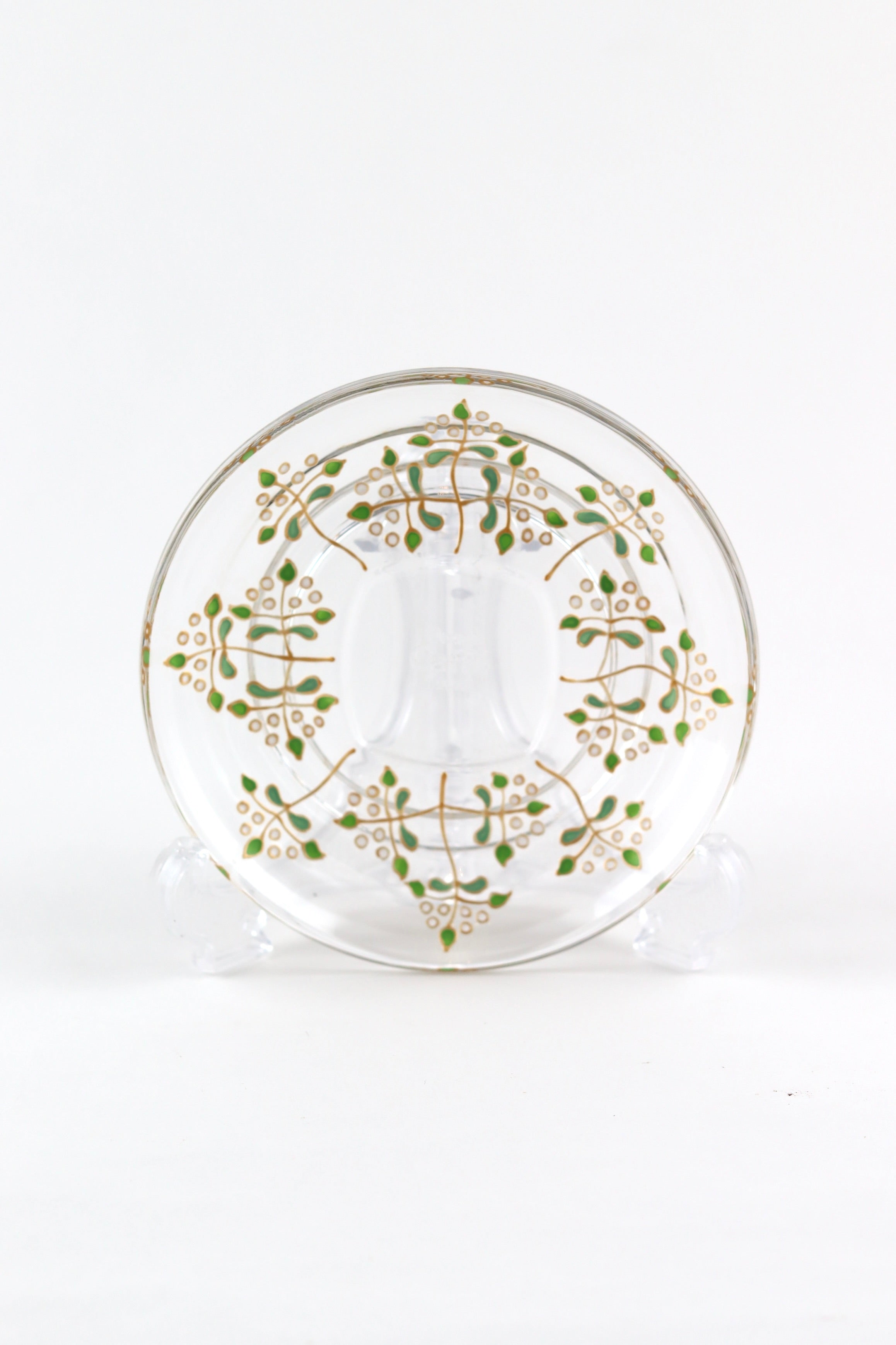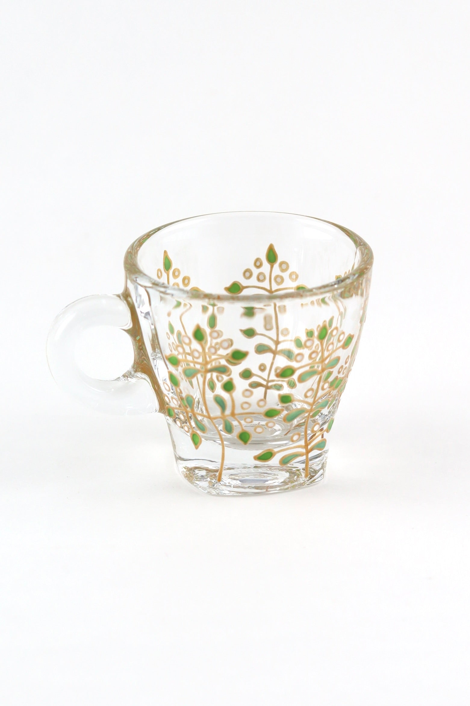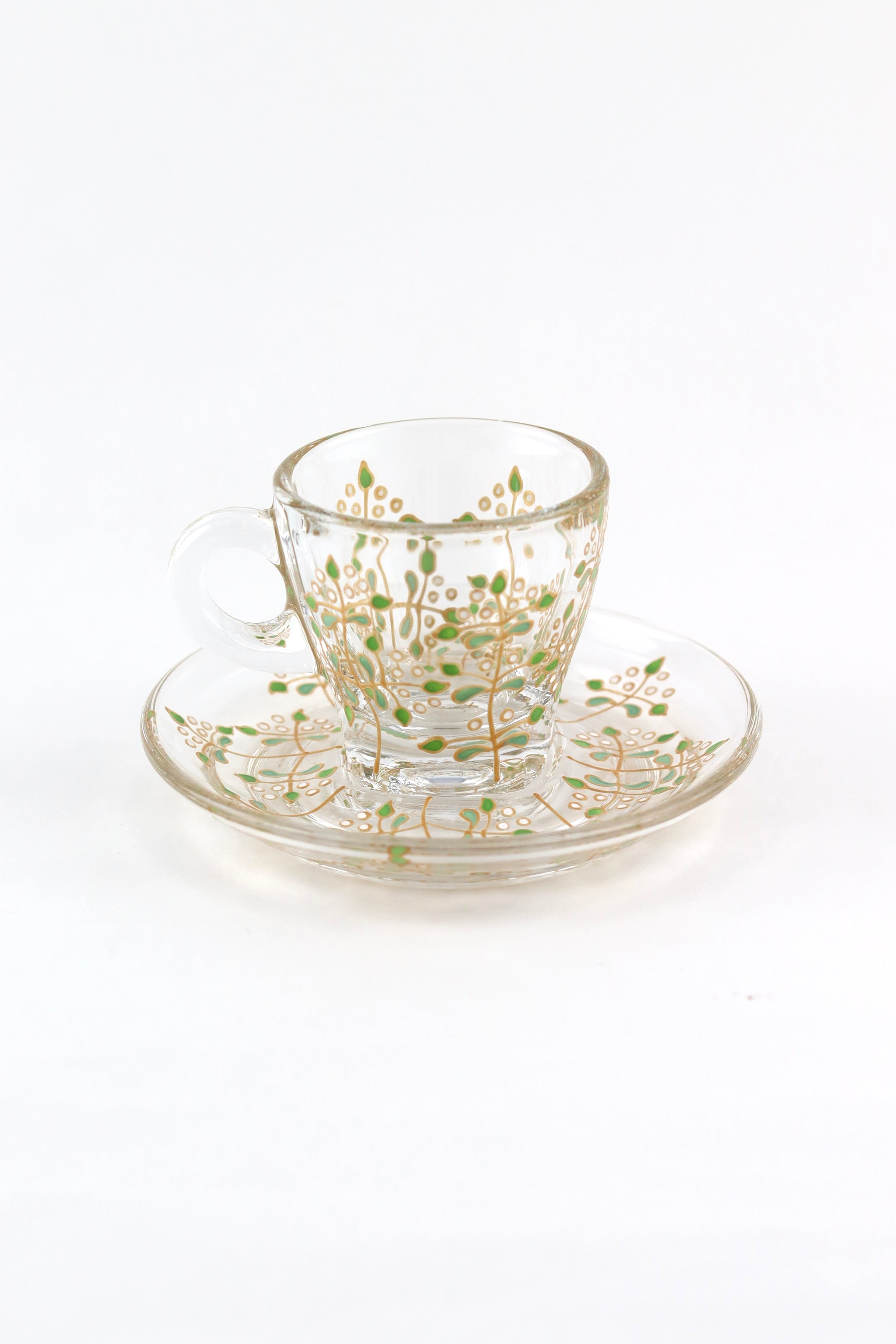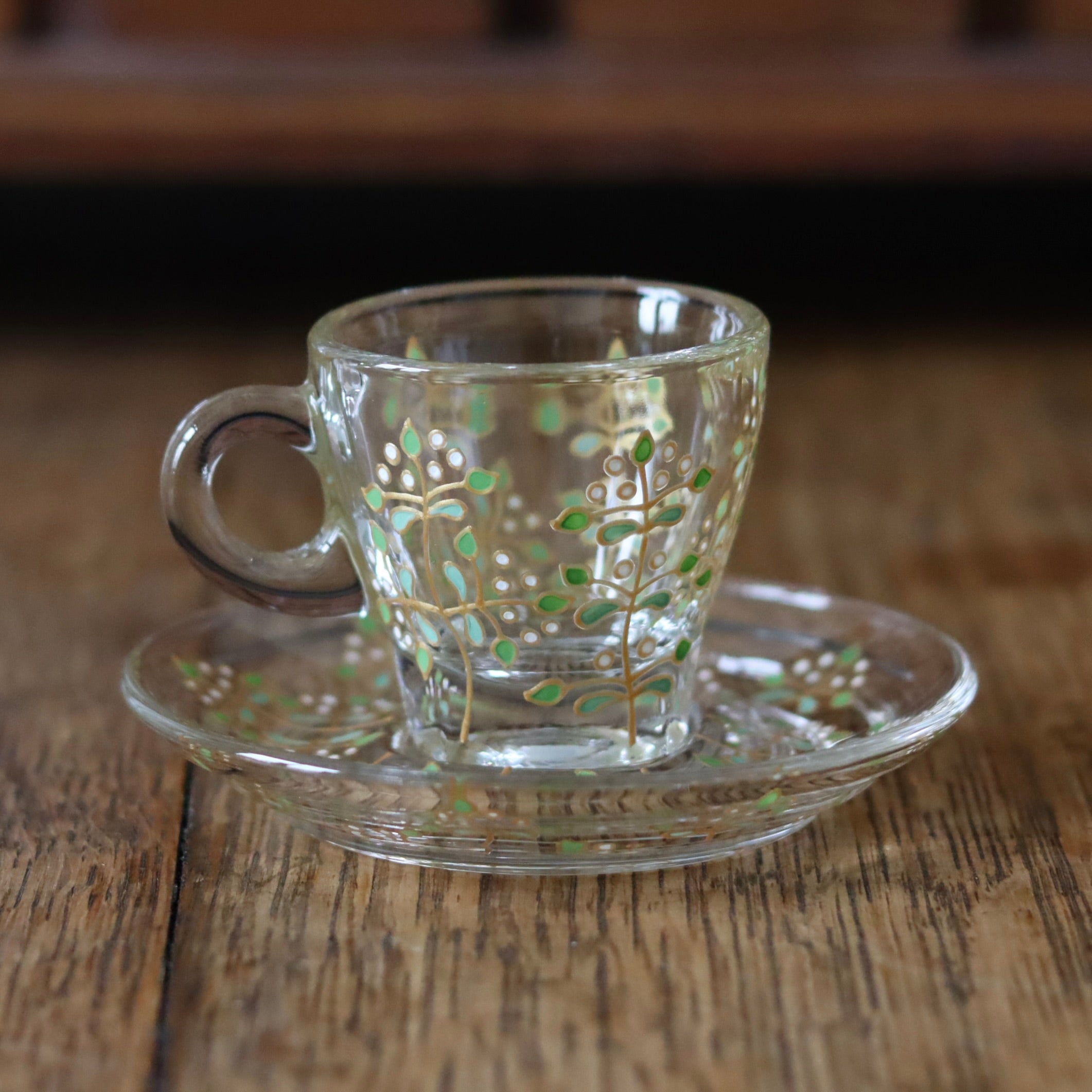 Crafted from high quality, soda lime glass, these sturdy glass cup and saucer sets are hand painted with a delicate rose vine design, featuring lots of little green leaves, all outlined in gold.