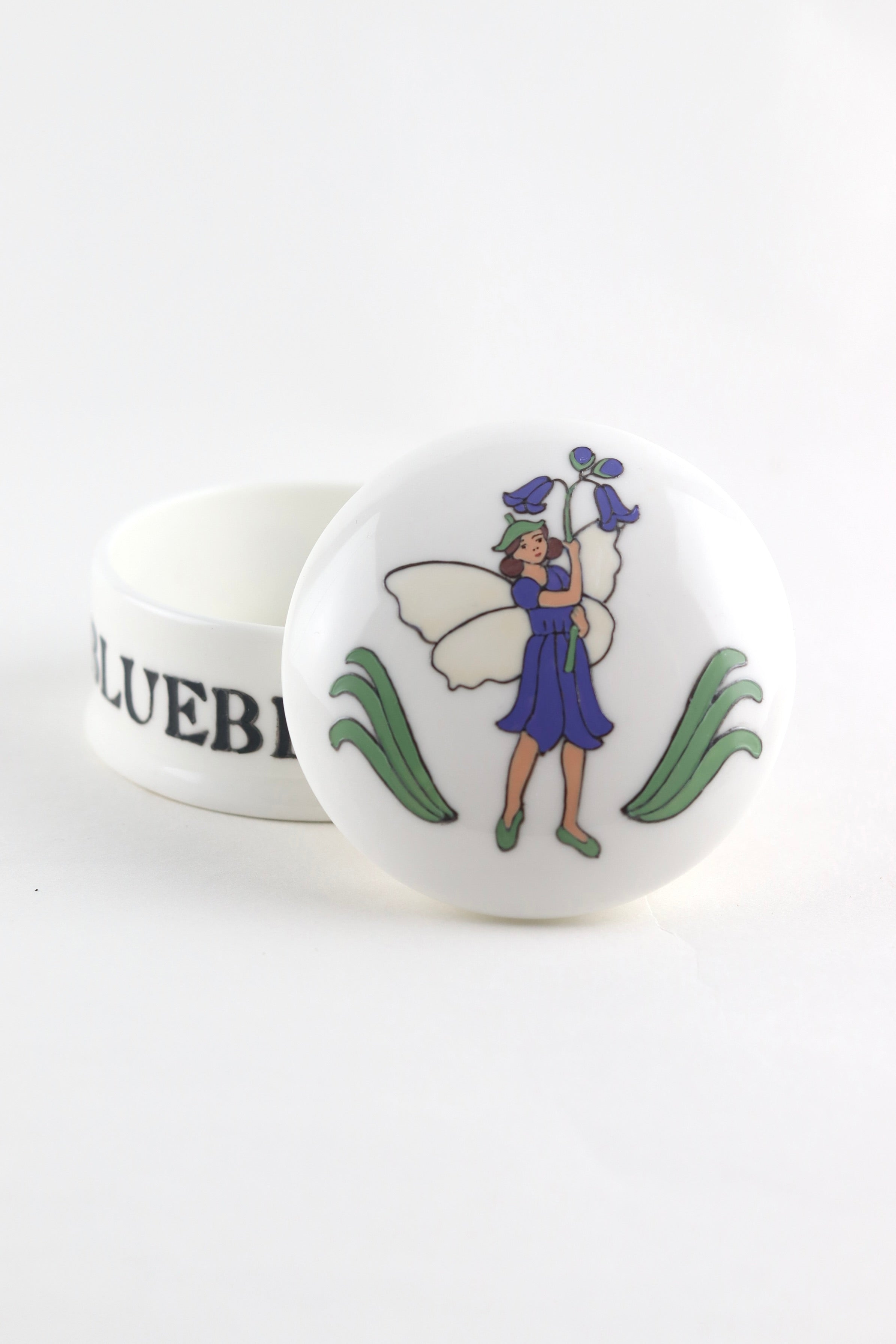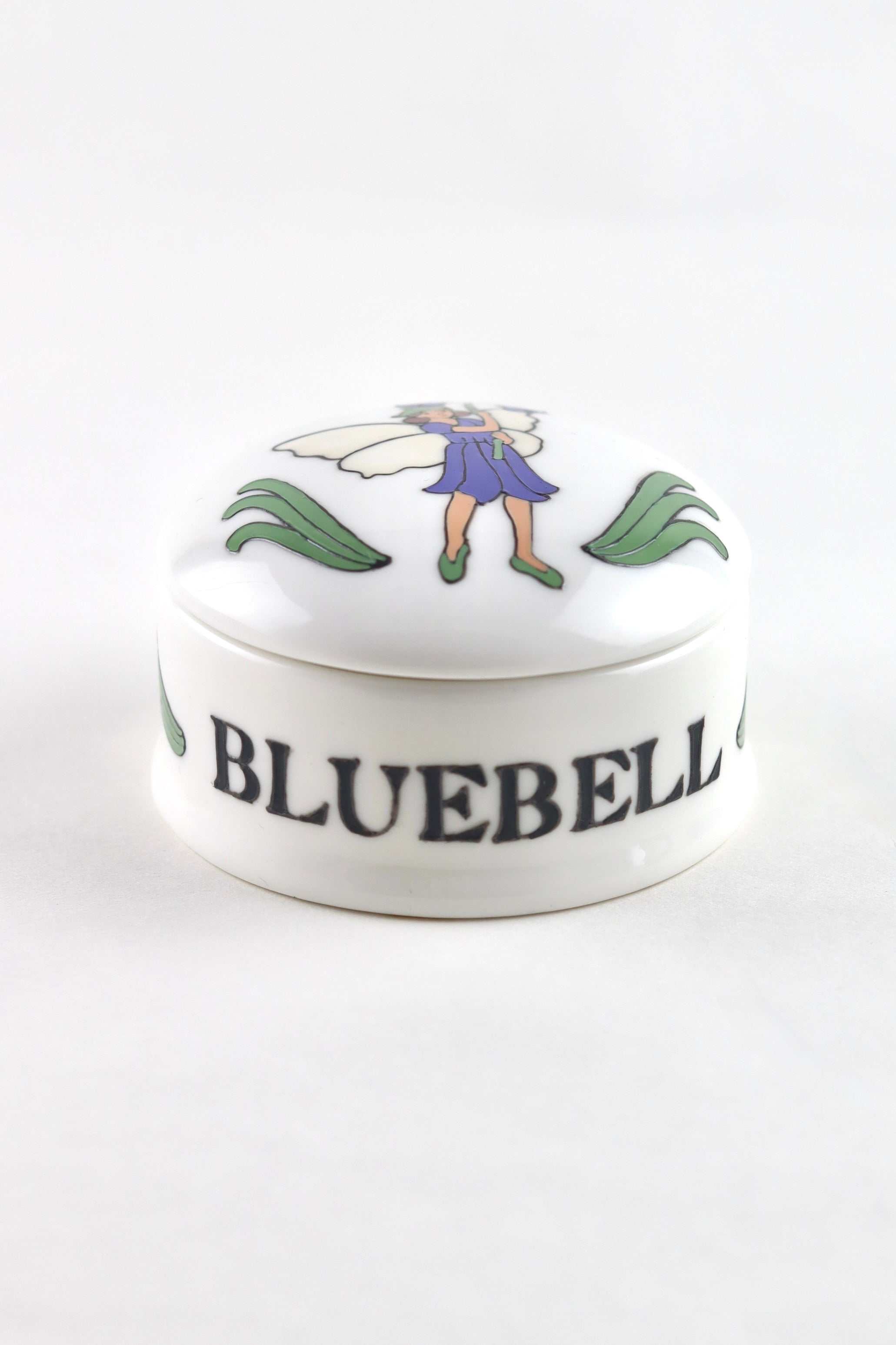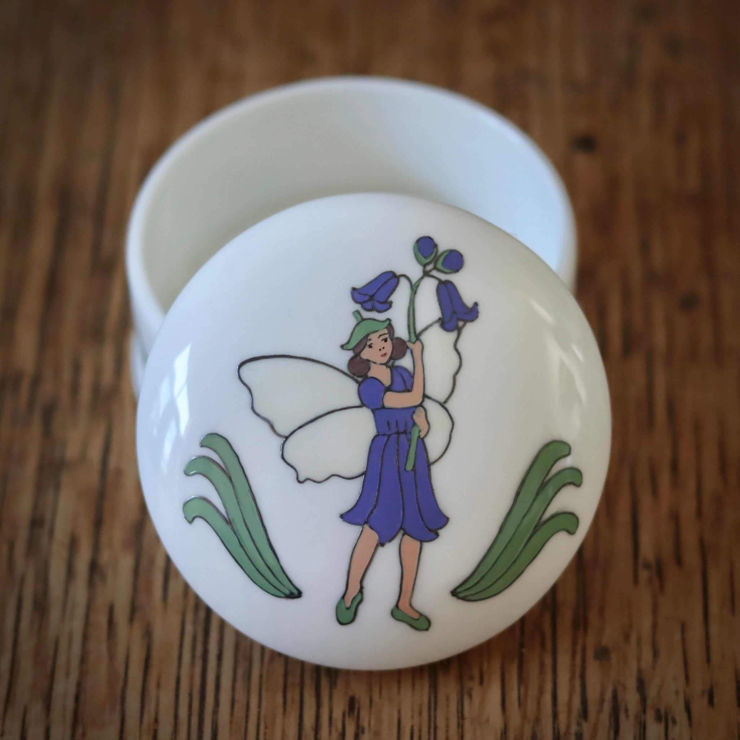 This lovely little trinket box is made from bone china and has a hand painted lid, depicting an intricately painted Bluebell Fairy surrounded by bluebell leaves. The sides are hand painted with more bluebell leaves and her name.