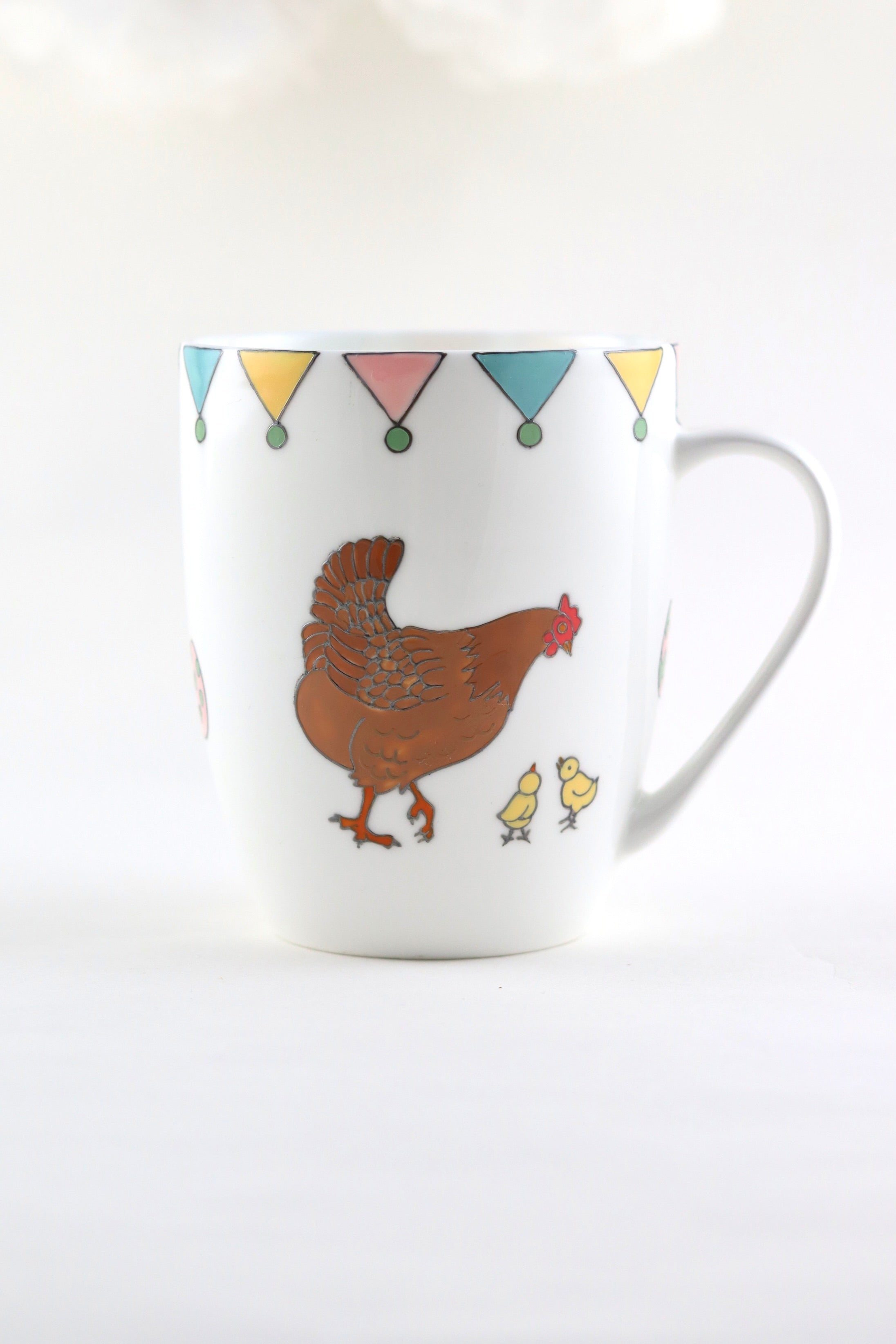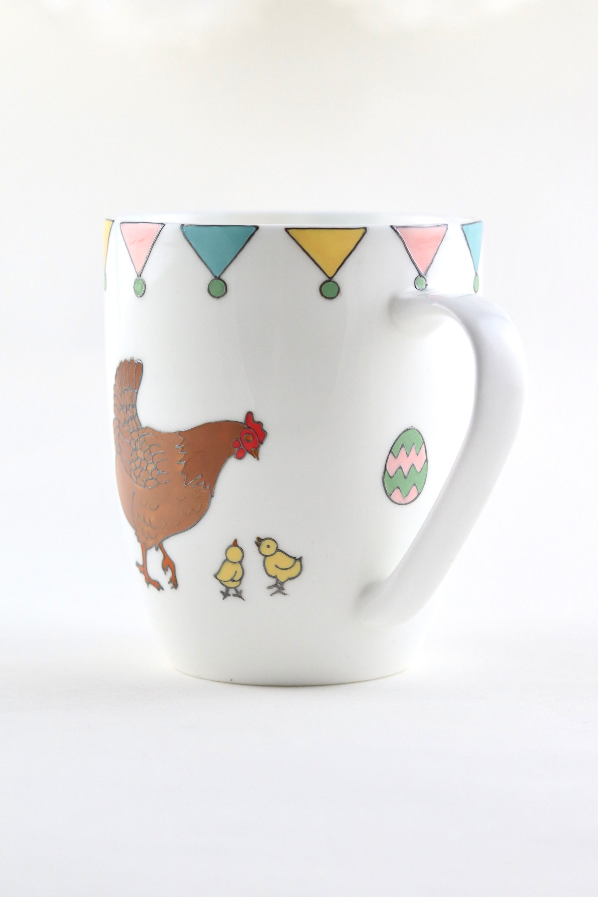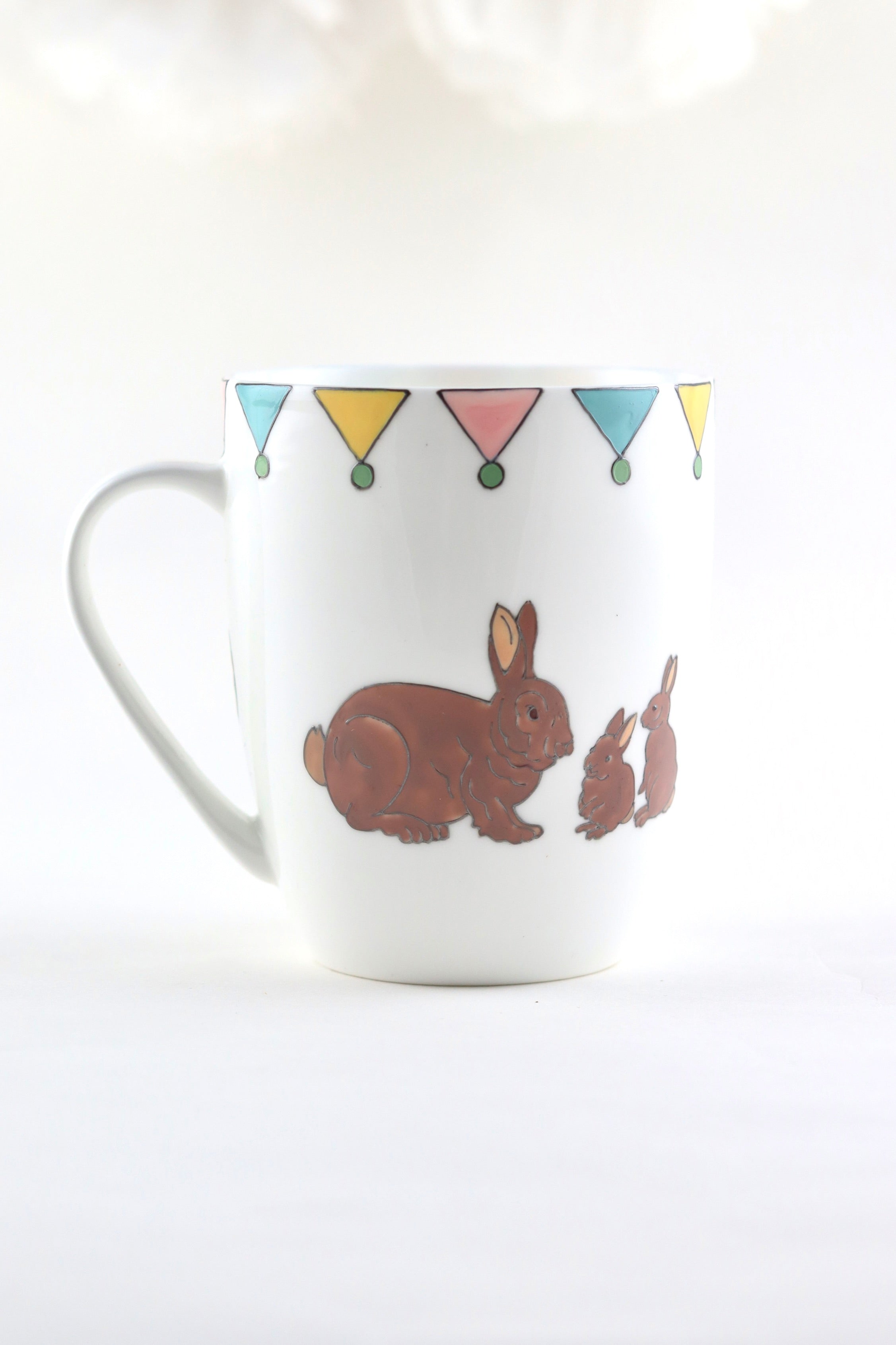 The mug is hand painted on one side a mummy rabbit and her two little bunnies. The other side of the mug is hand painted with a mummy hen and her two little chicks with the little painted eggs in between. Lastly, the mug is topped off with colourful bunting in spring shades of pink, yellow, teal and green.