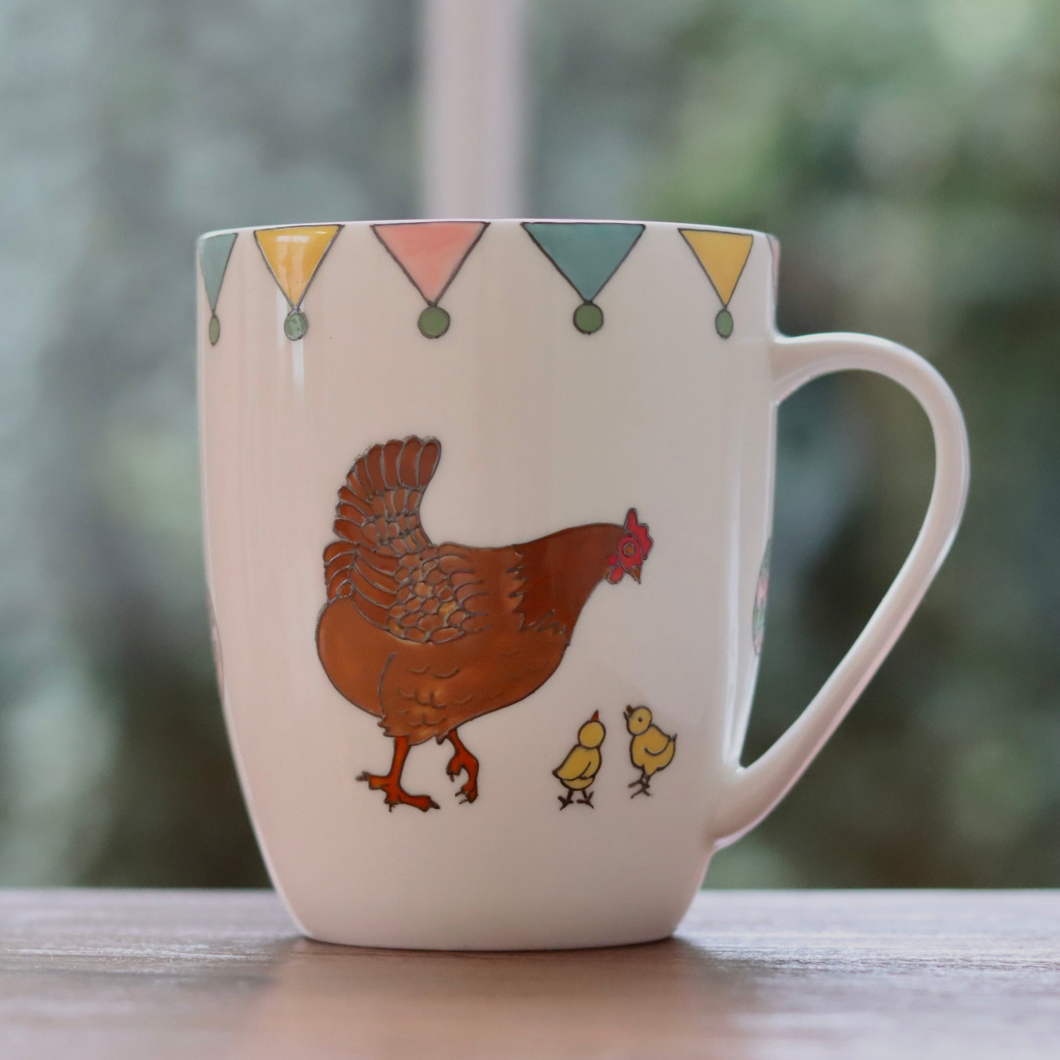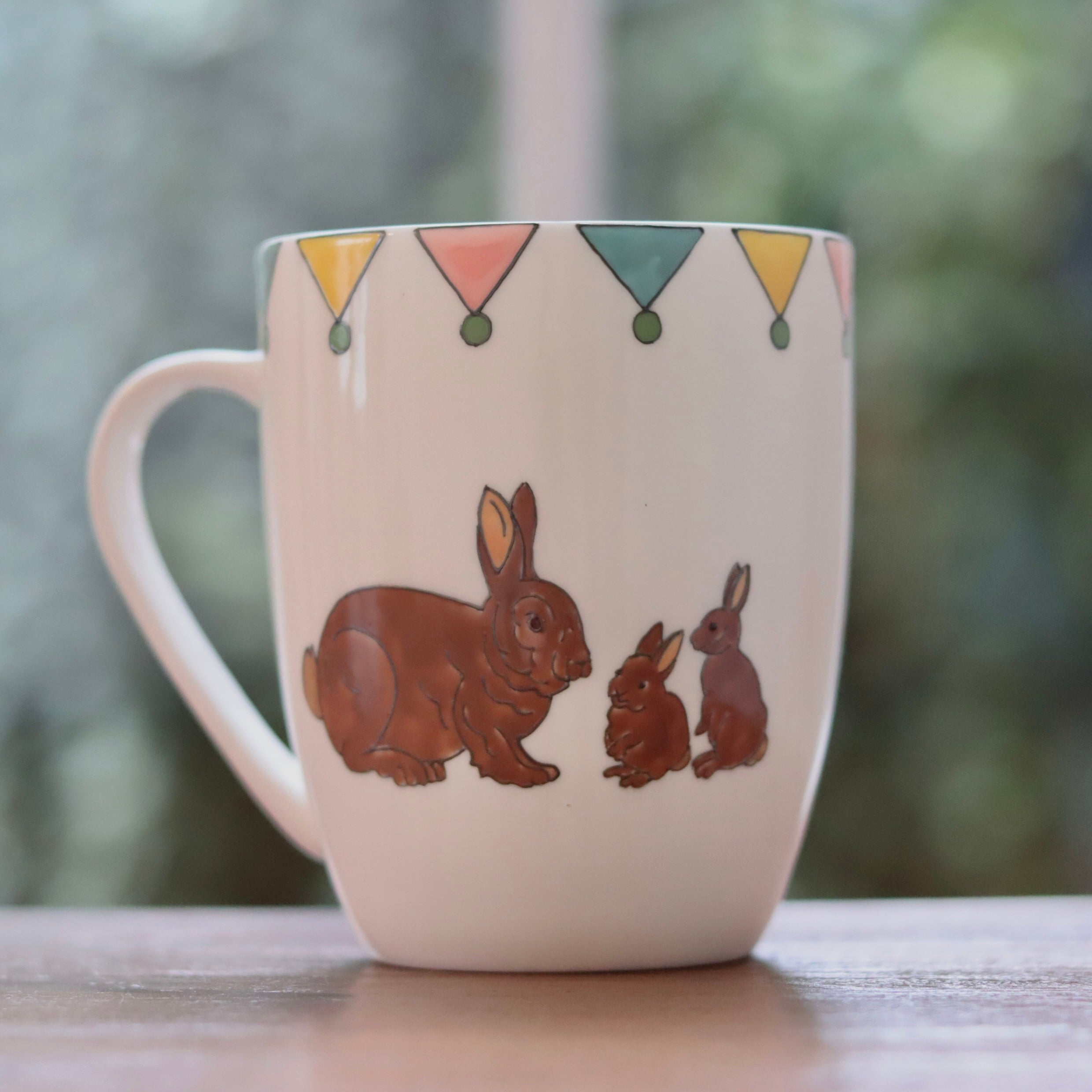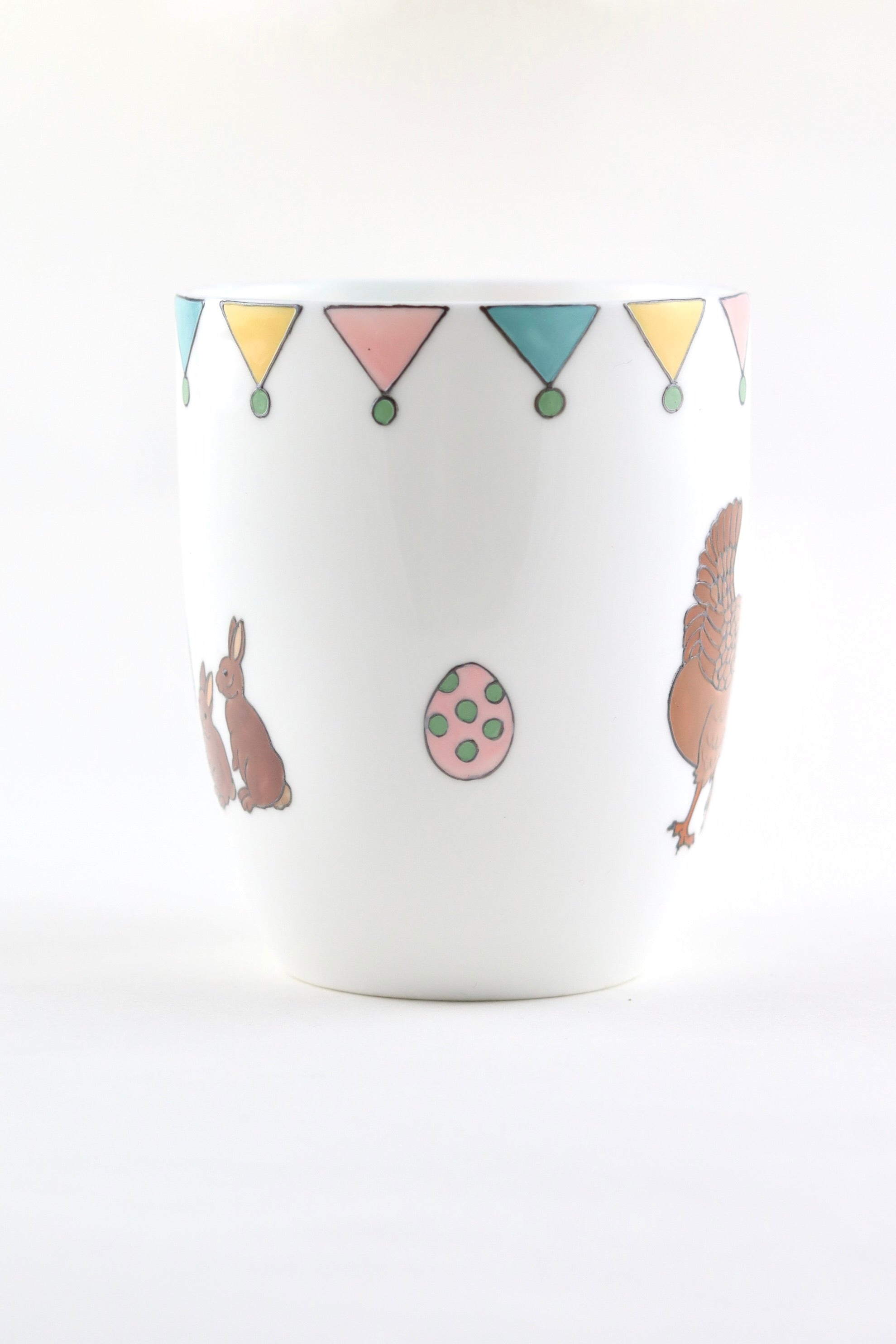 The mug is hand painted on one side a mummy rabbit and her two little bunnies. The other side of the mug is hand painted with a mummy hen and her two little chicks with the little painted eggs in between. Lastly, the mug is topped off with colourful bunting in spring shades of pink, yellow, teal and green.