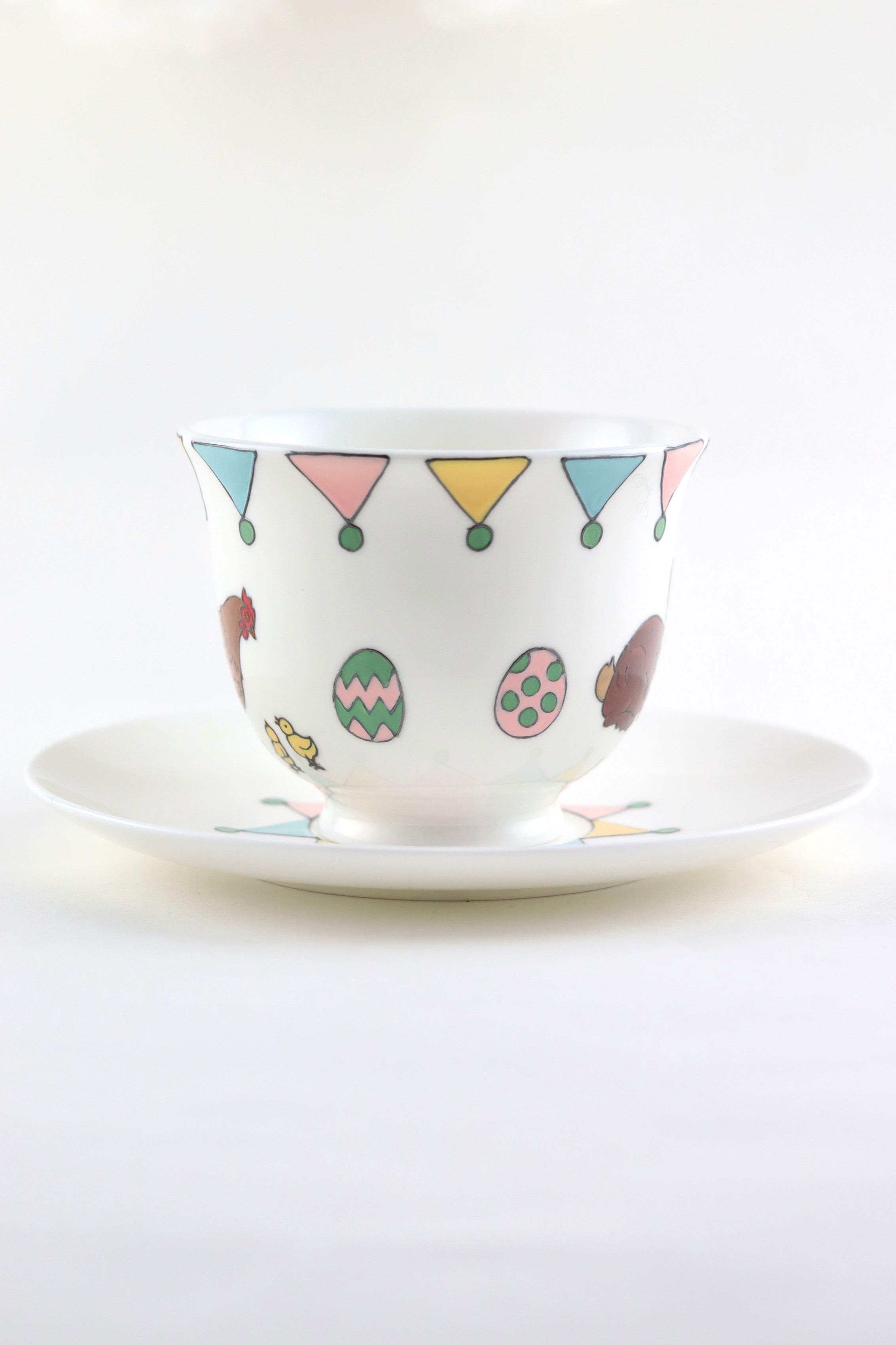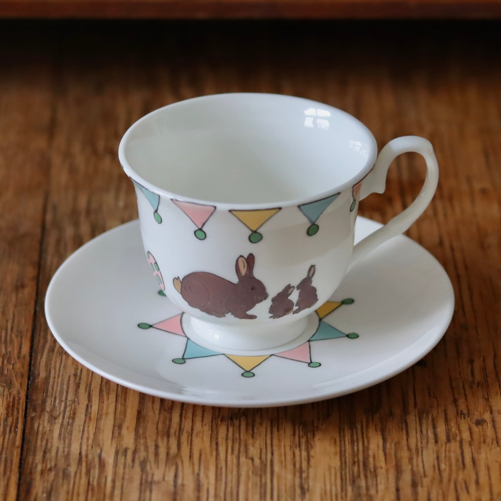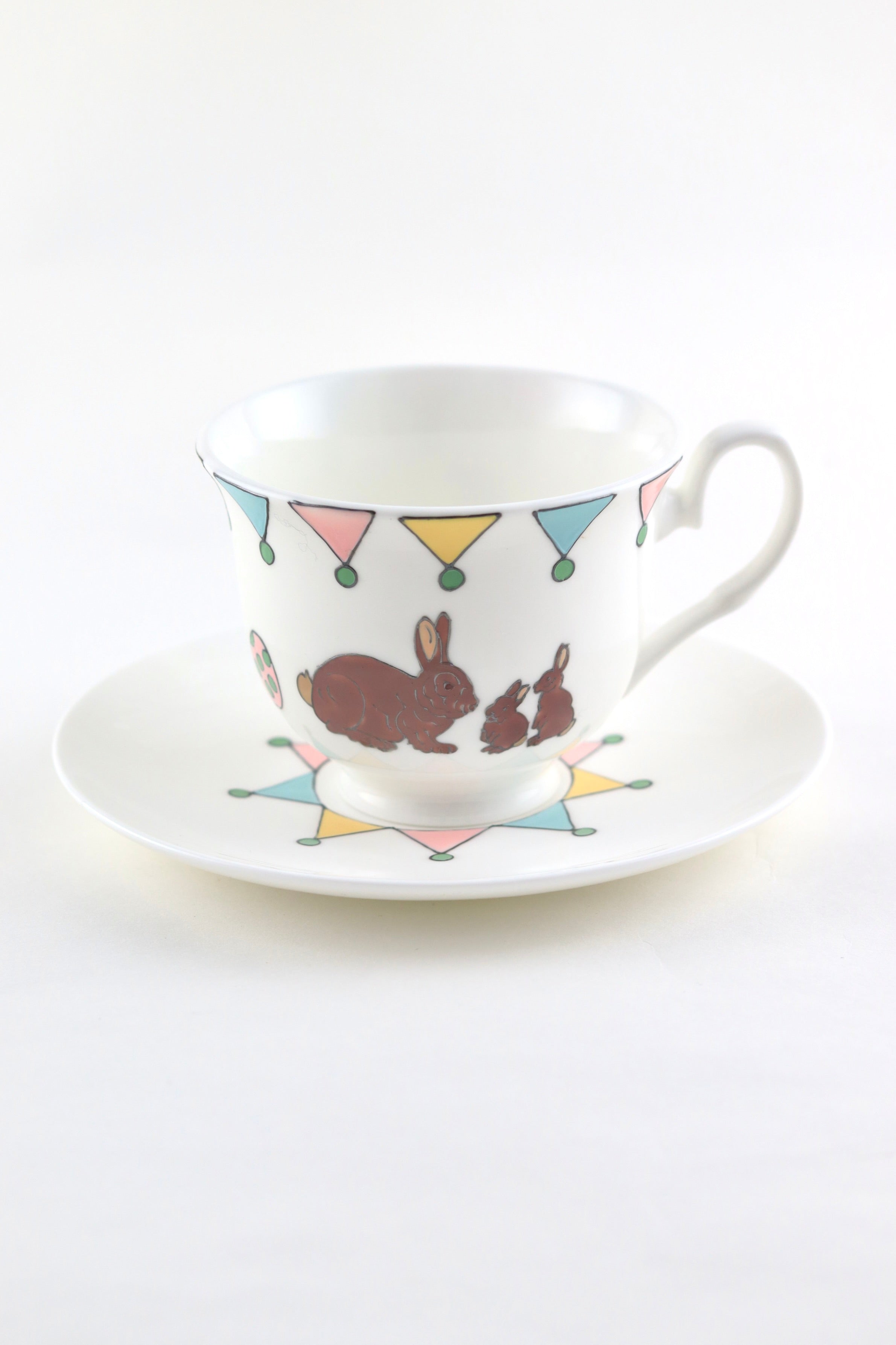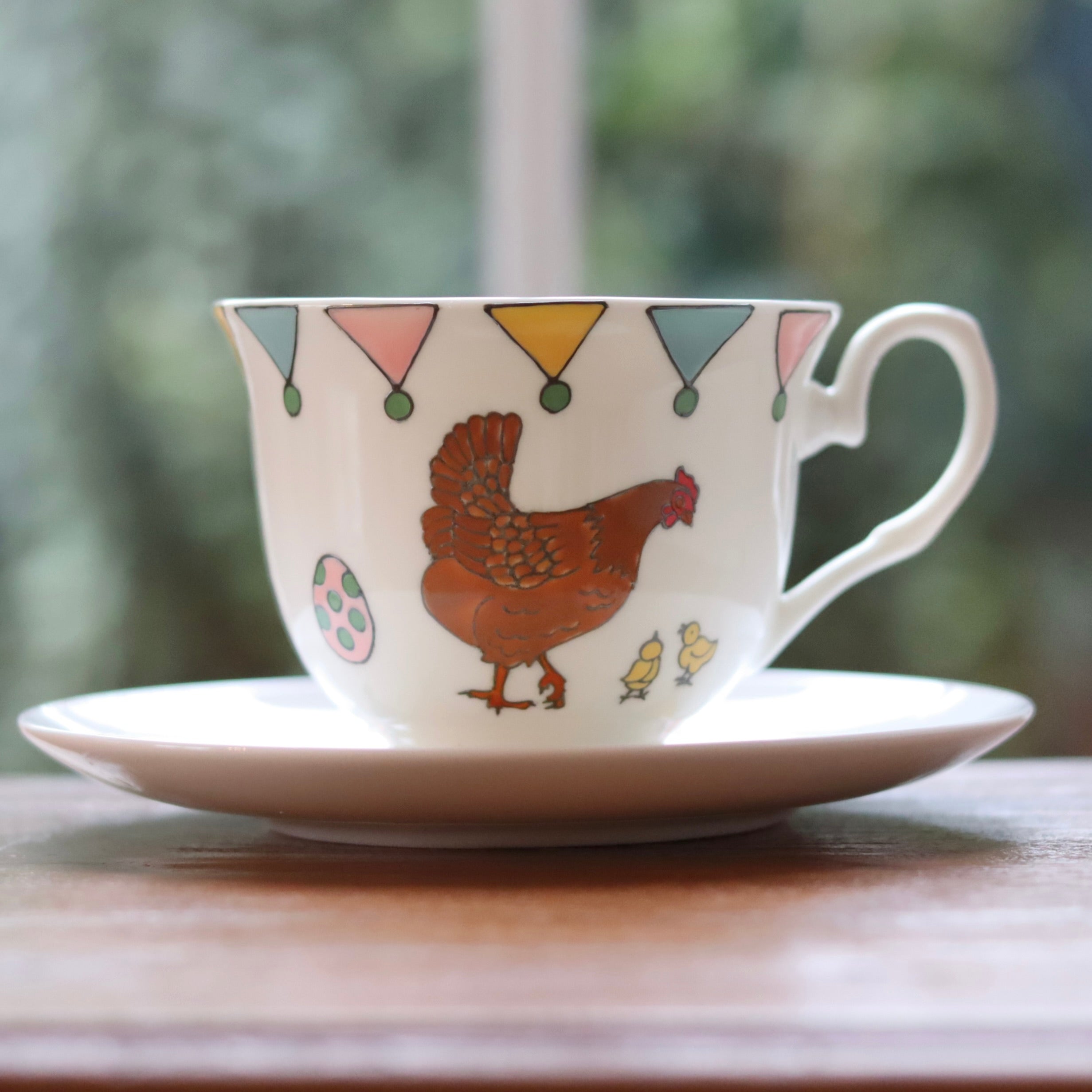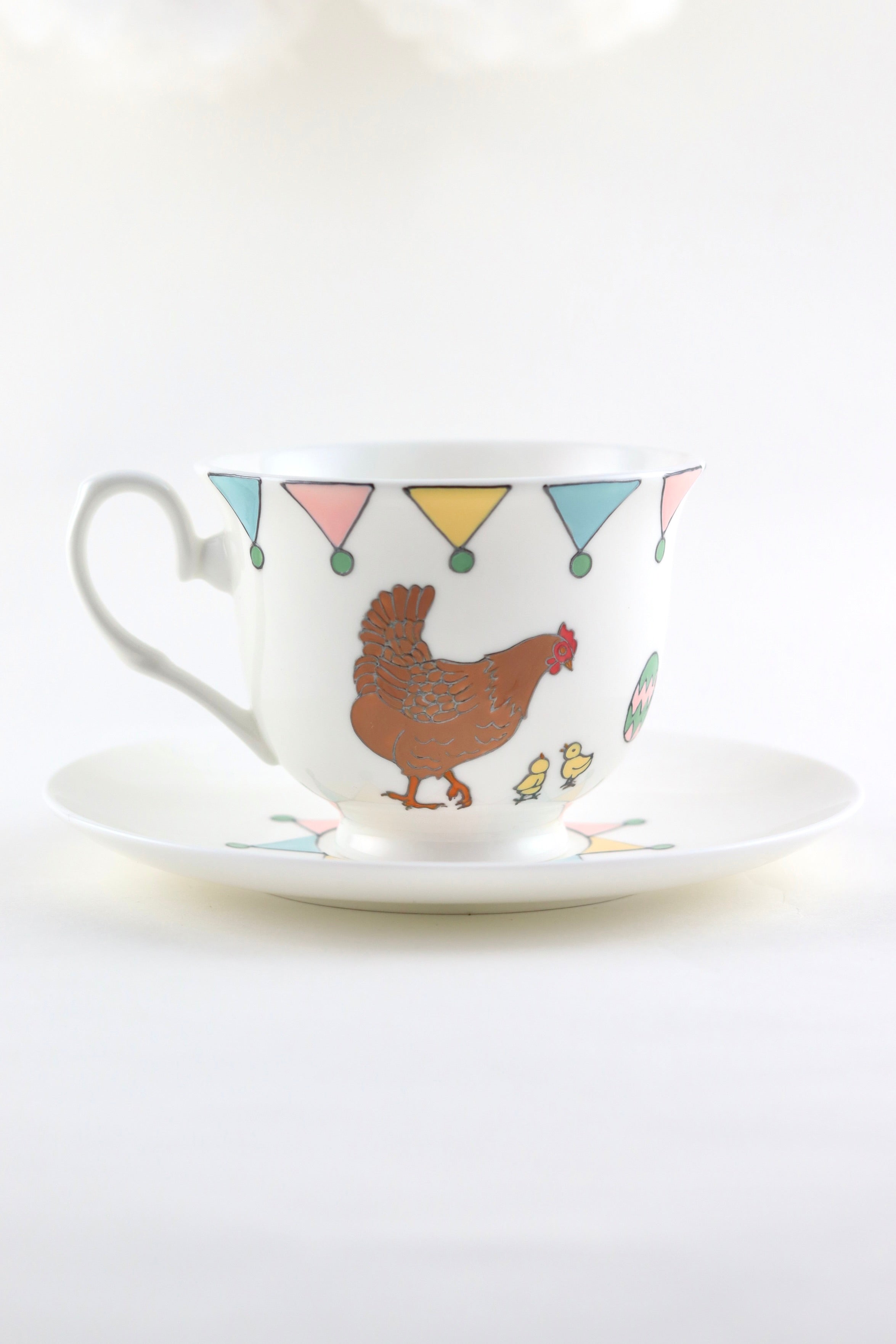 The teacup is hand painted on one side a mummy rabbit and her two little bunnies. The other side of the mug is hand painted with a mummy hen and her two little chicks with the little painted eggs in between. Lastly, the cup is topped off with colourful bunting in spring shades of pink, yellow, teal and green which is echoed on the saucer.