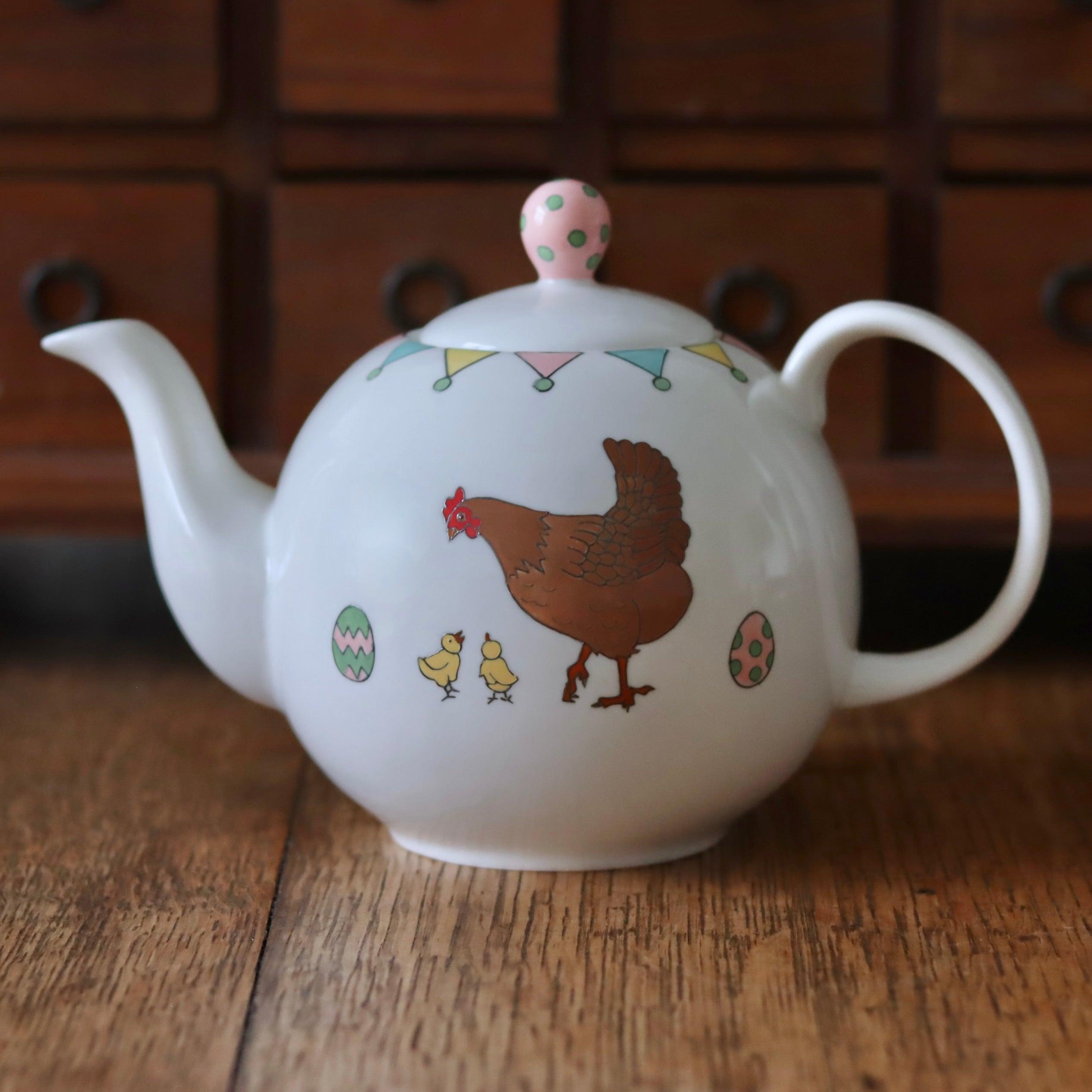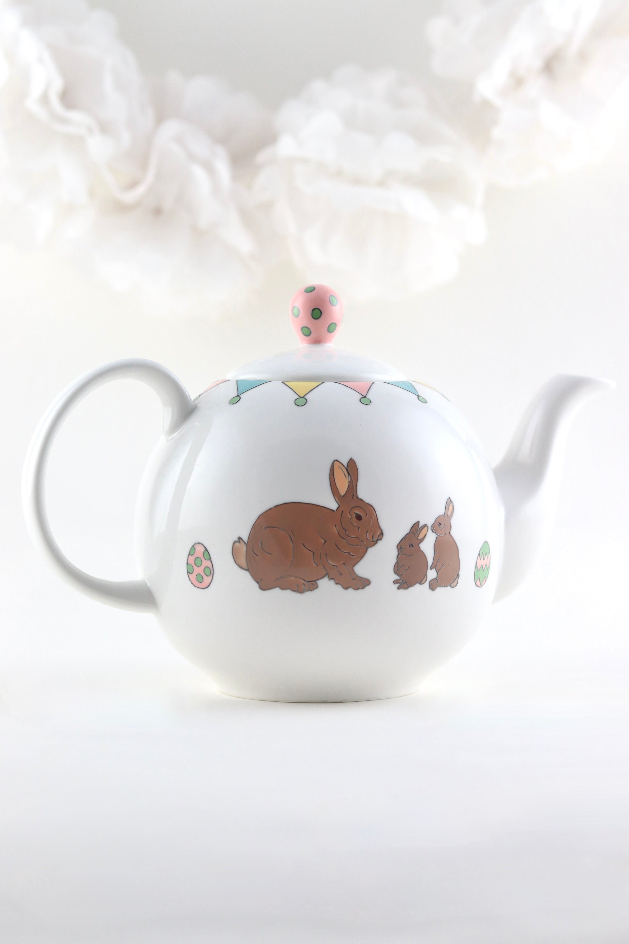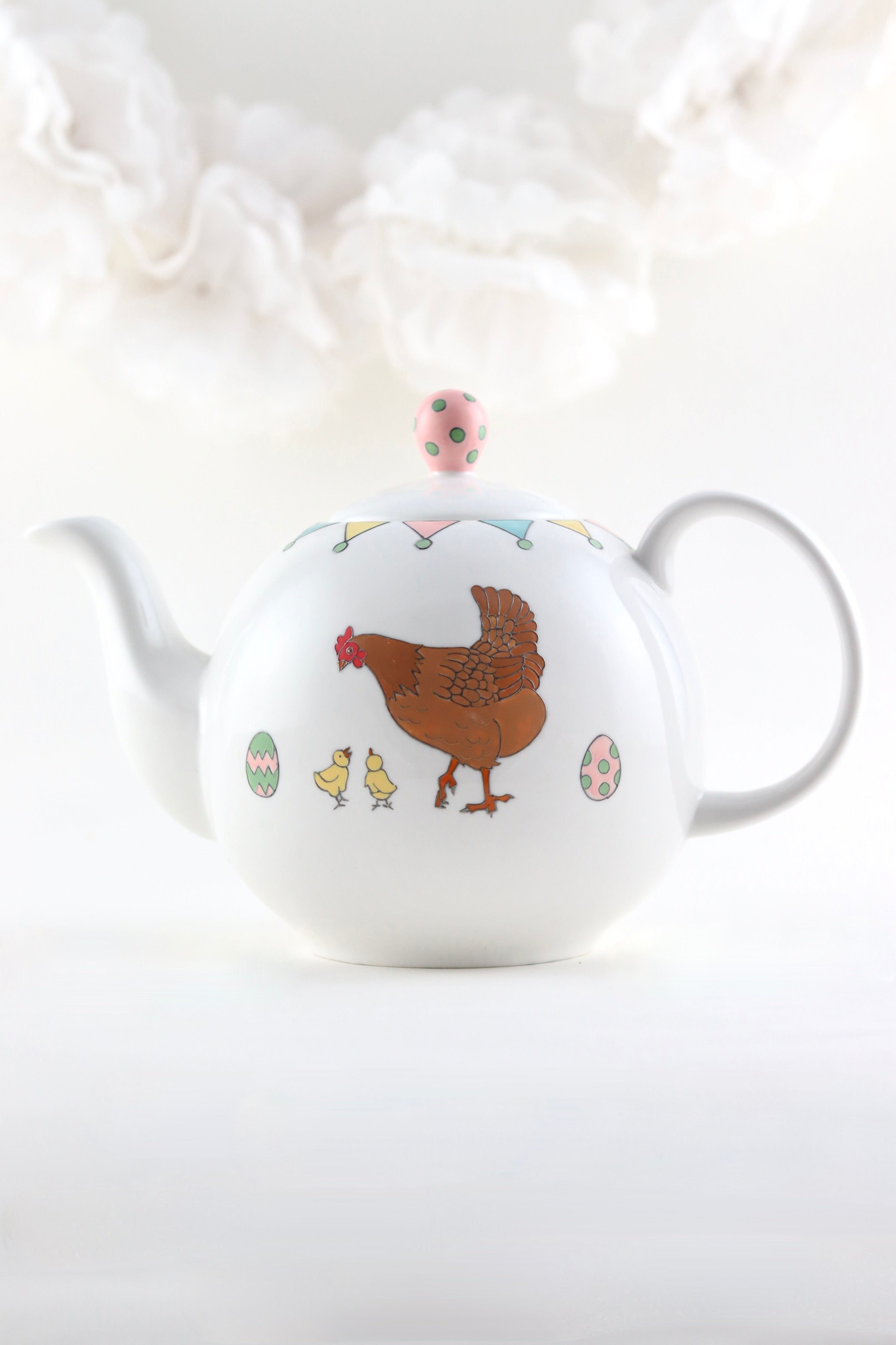 The teapot is hand painted on one side a mummy rabbit and her two little bunnies. The other side of the teapot is hand painted with a mummy hen and her two little chicks. The lid of the teapot is painted to look like a decorated egg, echoing the little eggs around the middle. Lastly, the teapot is topped off with colourful bunting in spring shades of pink, yellow, teal and green.