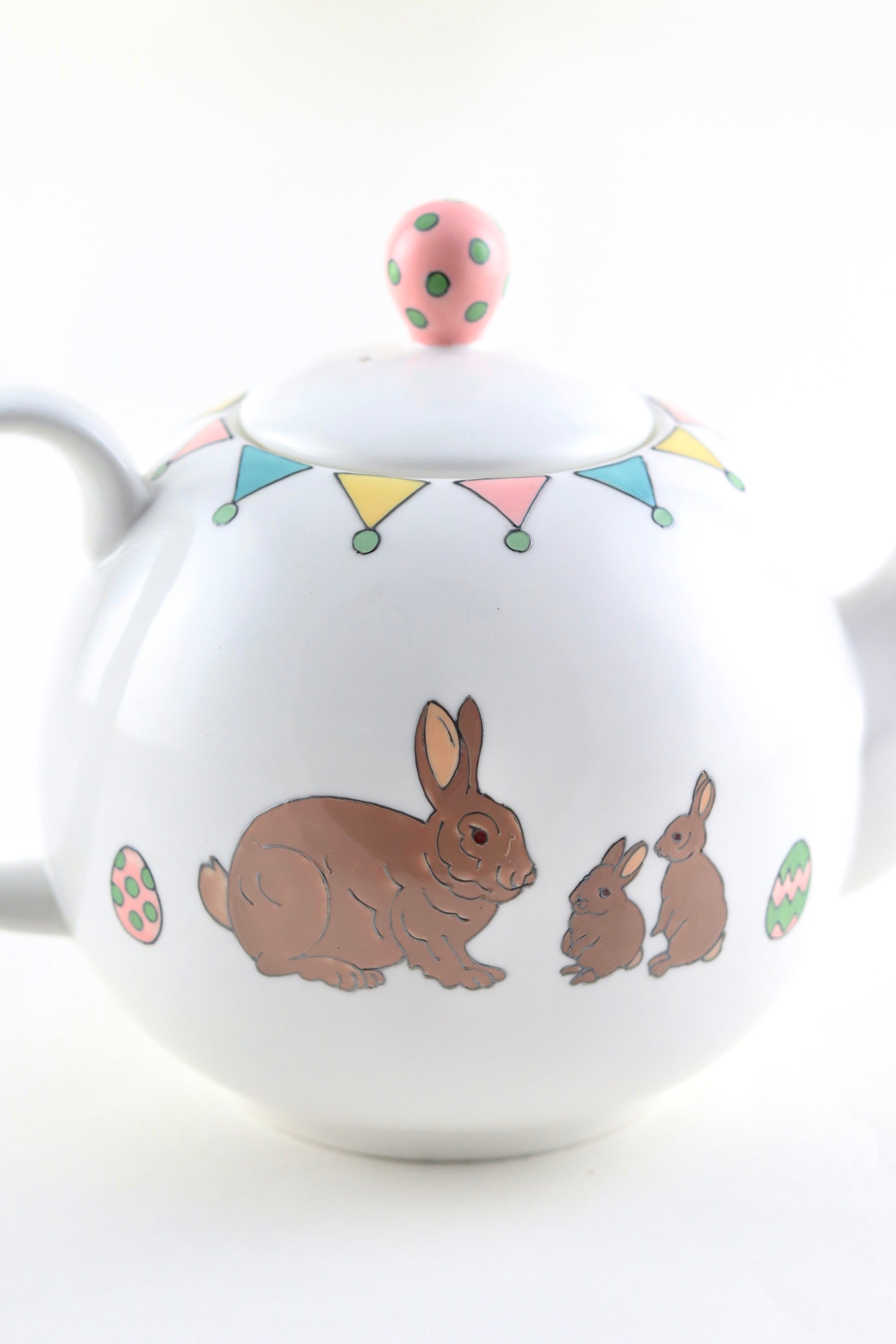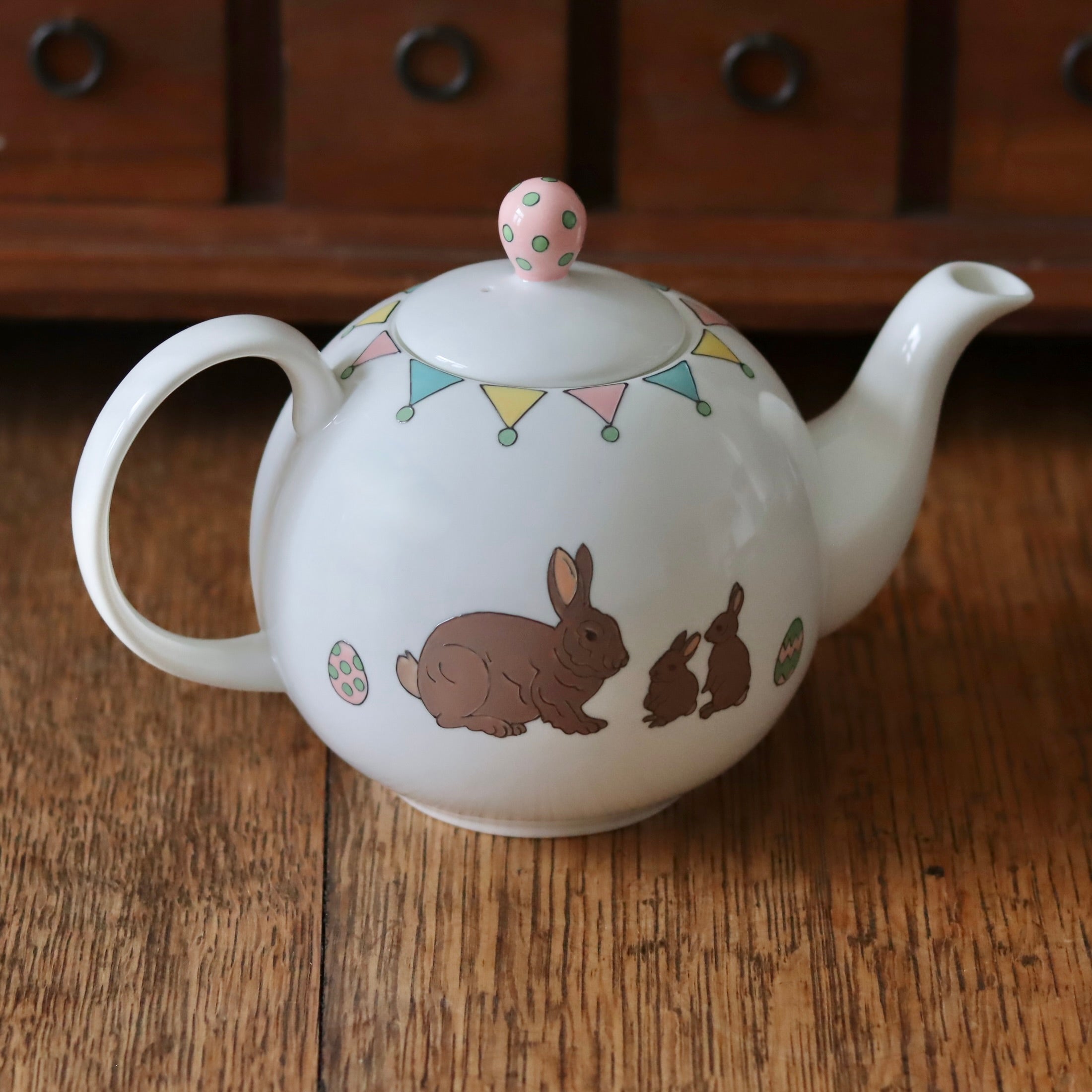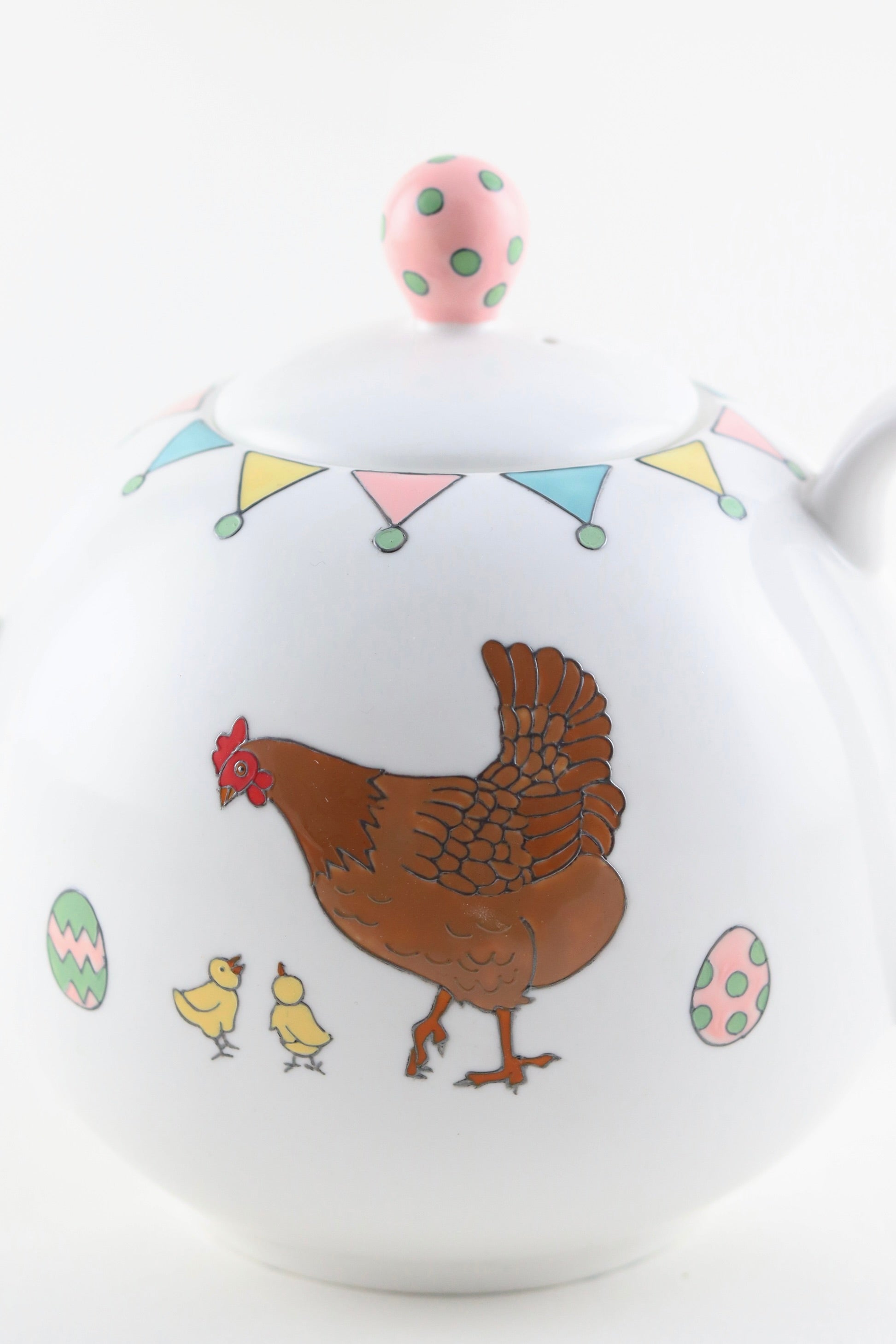 The teapot is hand painted on one side a mummy rabbit and her two little bunnies. The other side of the teapot is hand painted with a mummy hen and her two little chicks. The lid of the teapot is painted to look like a decorated egg, echoing the little eggs around the middle. Lastly, the teapot is topped off with colourful bunting in spring shades of pink, yellow, teal and green.