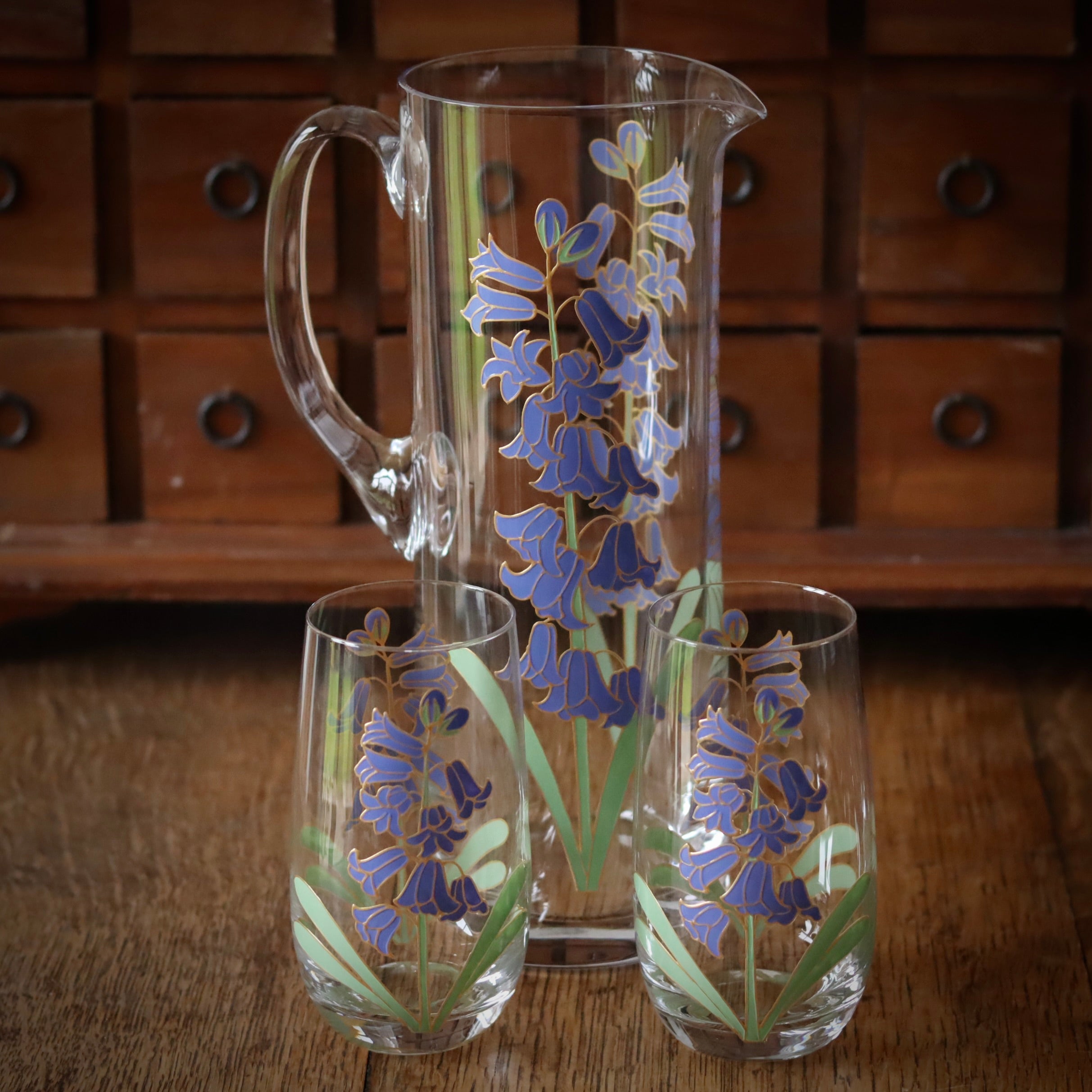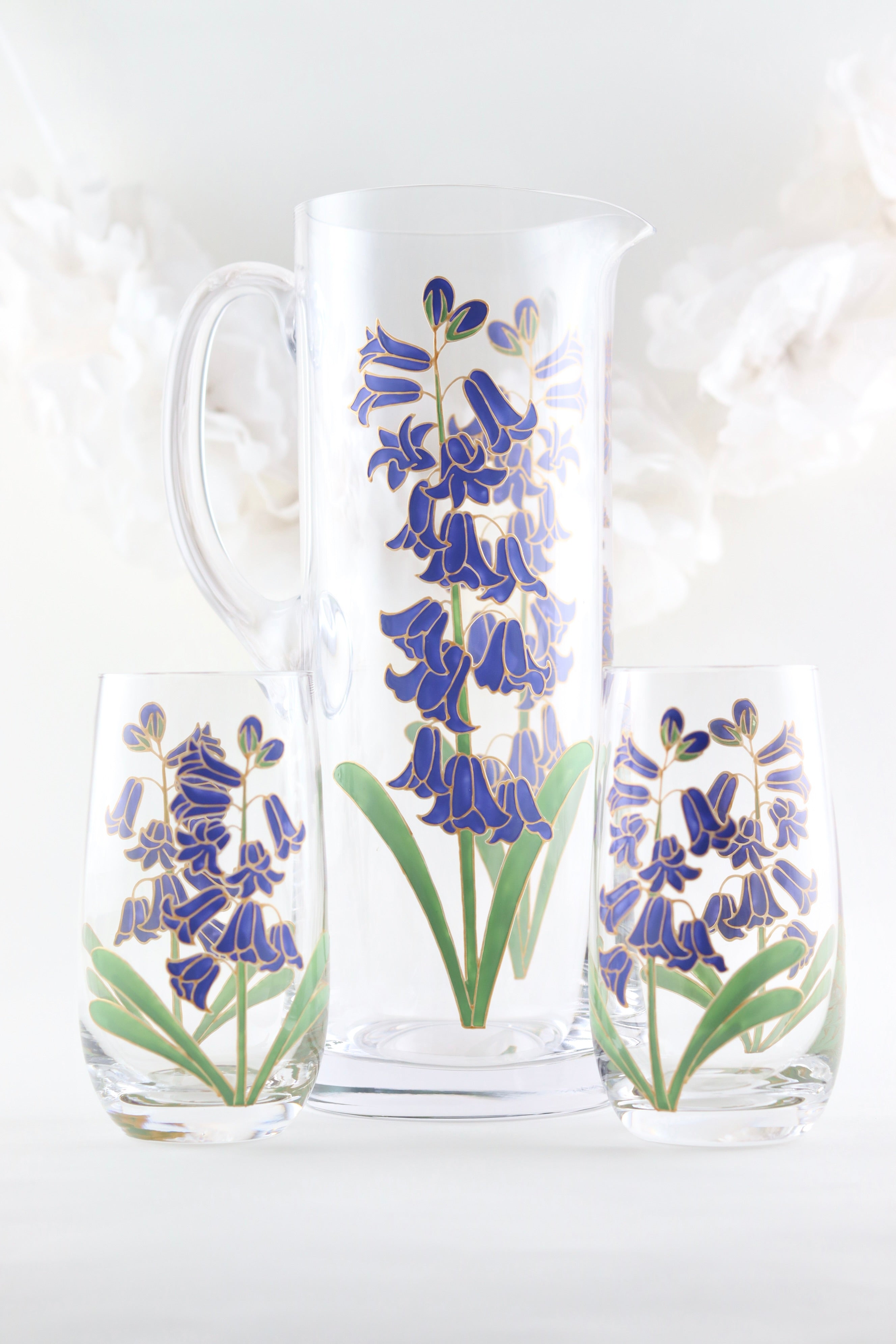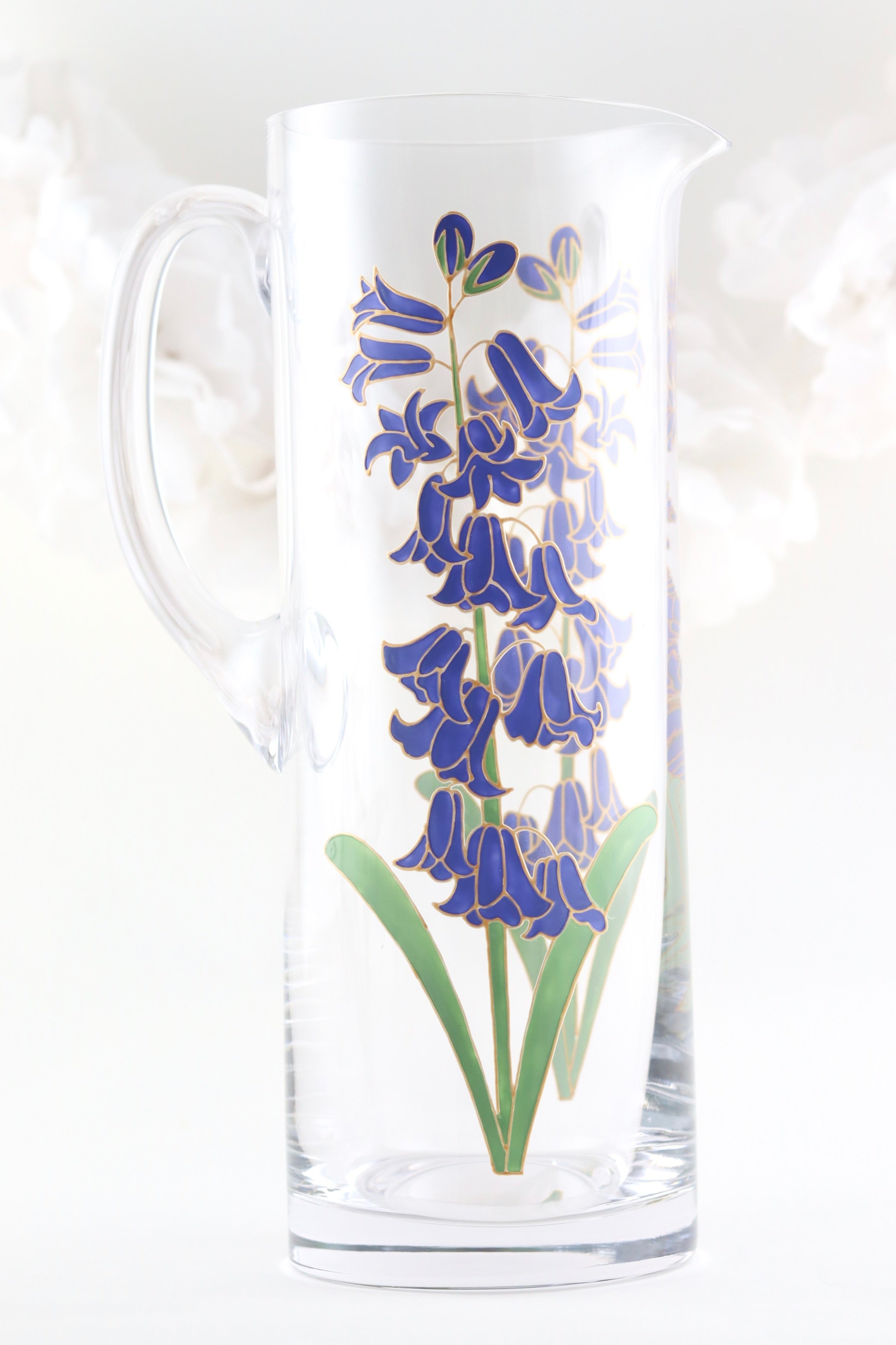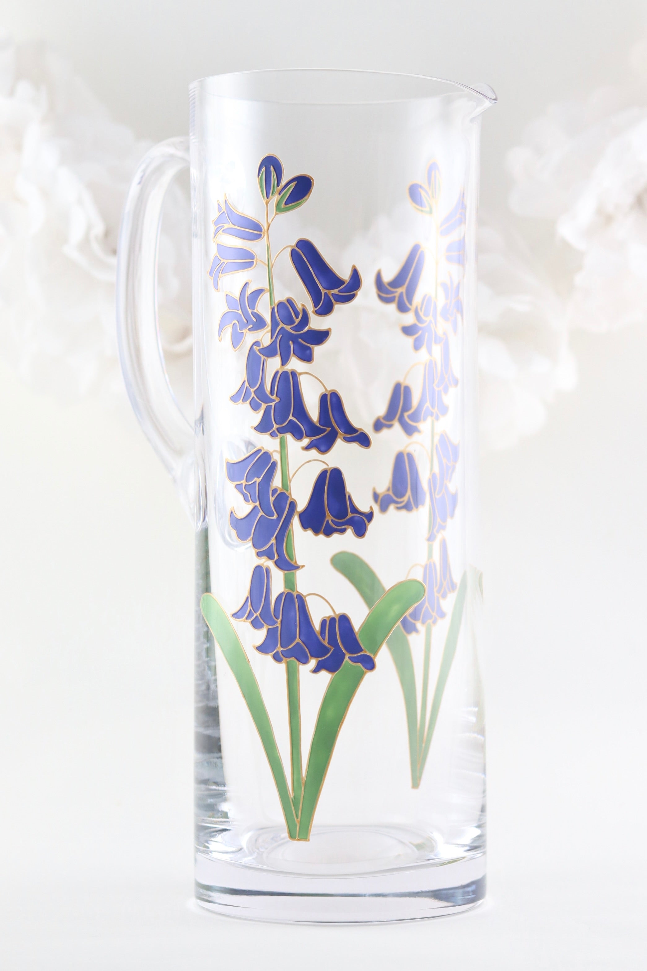 This beautiful , lead free crystal pitcher holds 2000ml and is hand painted with a bluebell design, featuring two stems of bluebells, one on each side. It measures 30cm tall and 13.5 cm wide.