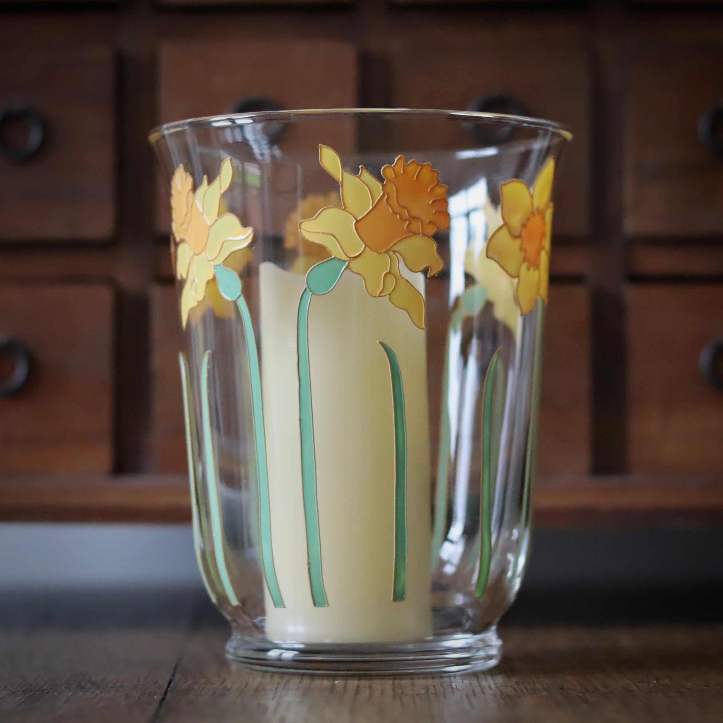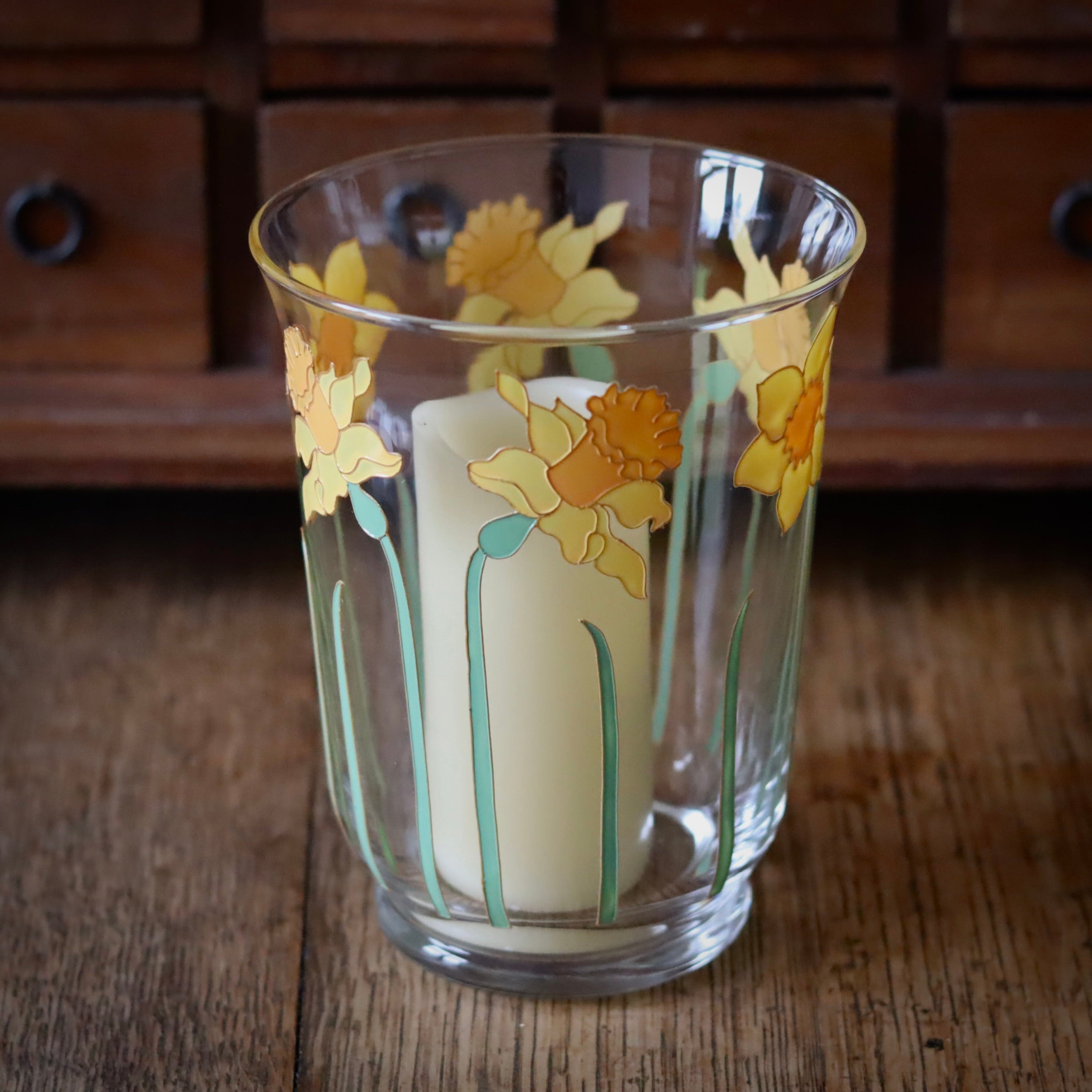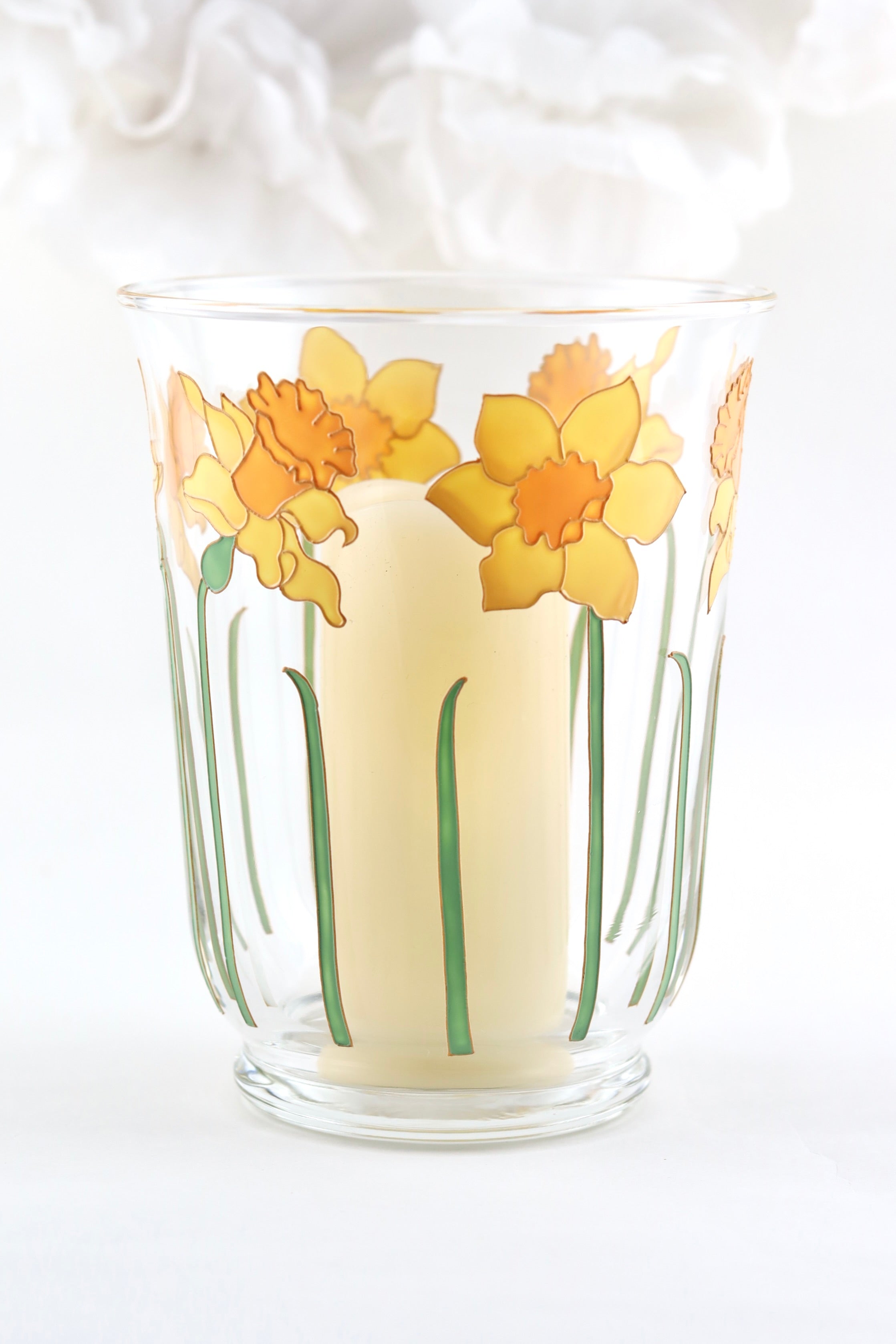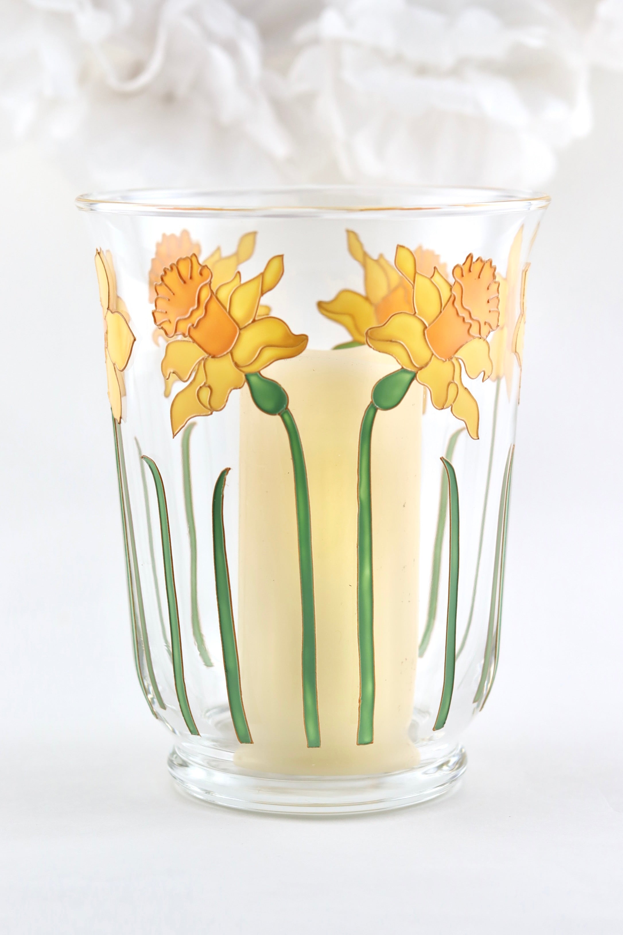 This joyful, daffodil design design is hand painted on to a mouth blown, glass hurricane vase that is suitable for use with a candle (not included) or as a small vase. It stands 18cm tall and measures 14cm across the top.