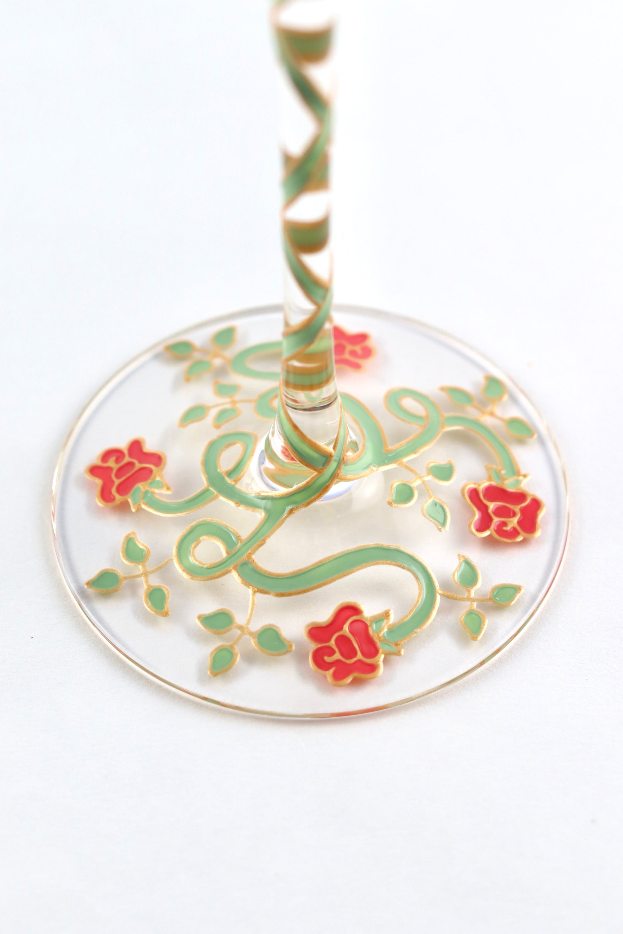 Each lead-free crystal flute measures 23cm tall, holds 220ml and is hand-painted with one the pair of lovers , surrounded by rose vines and a quote from the play.