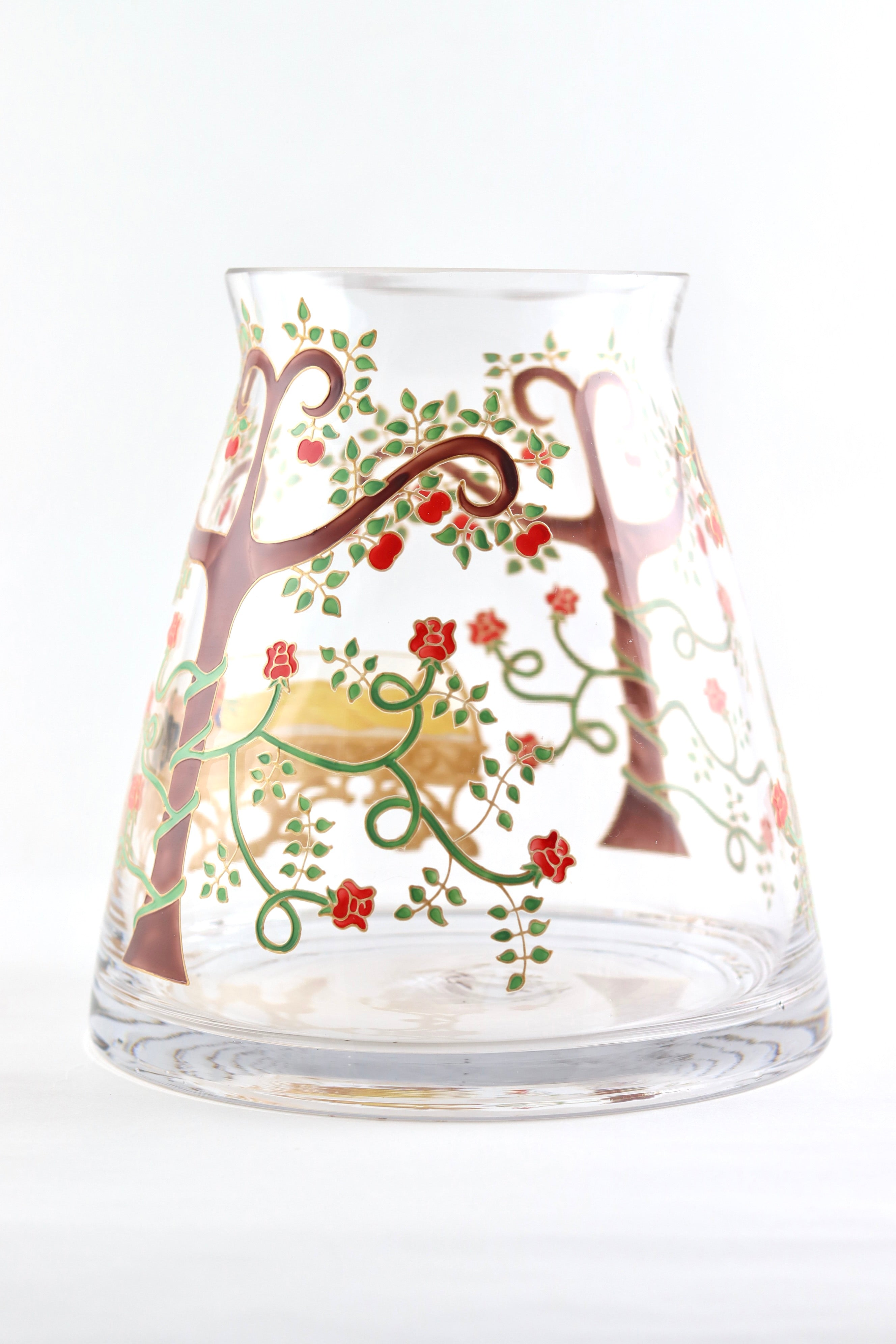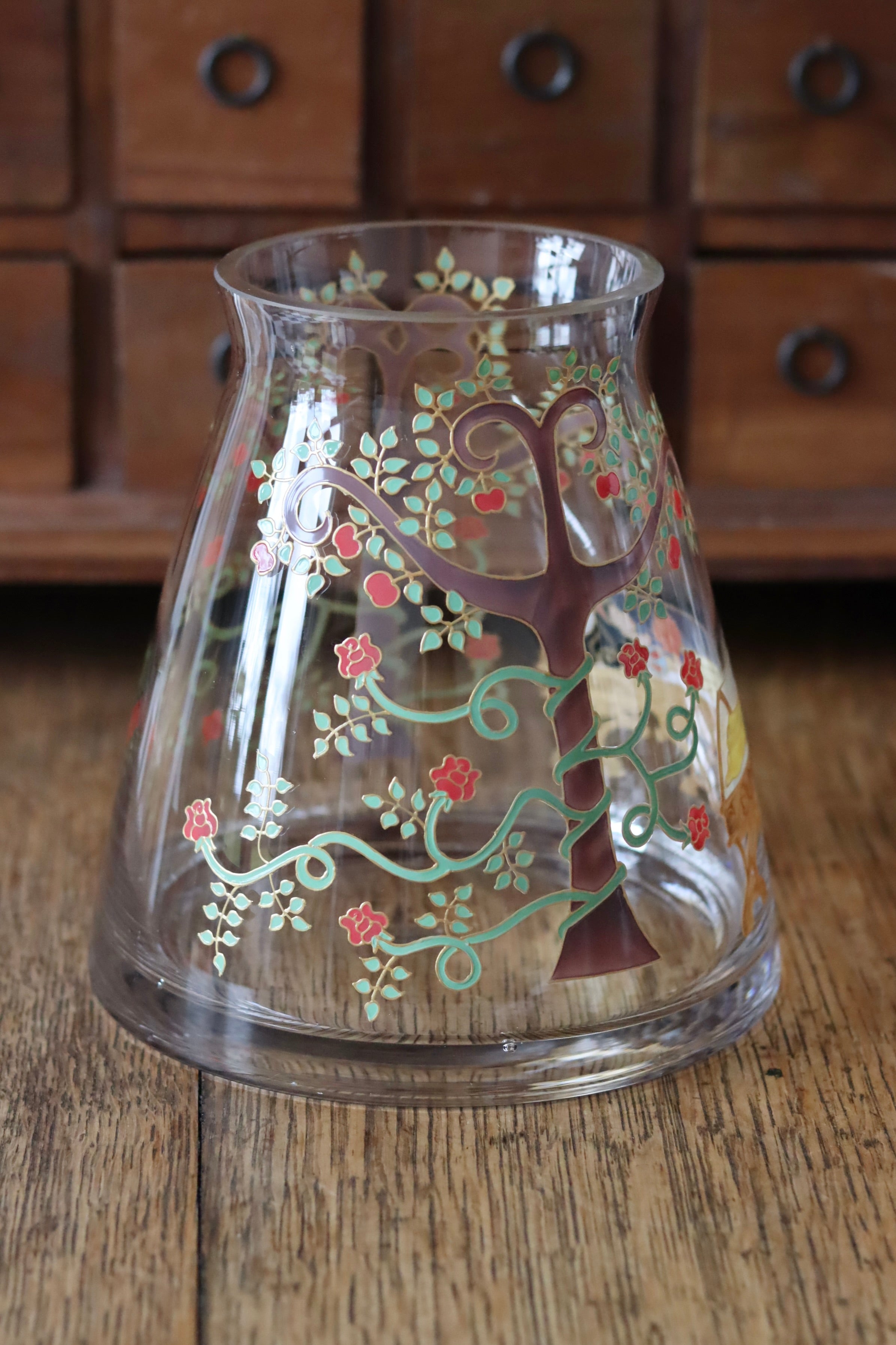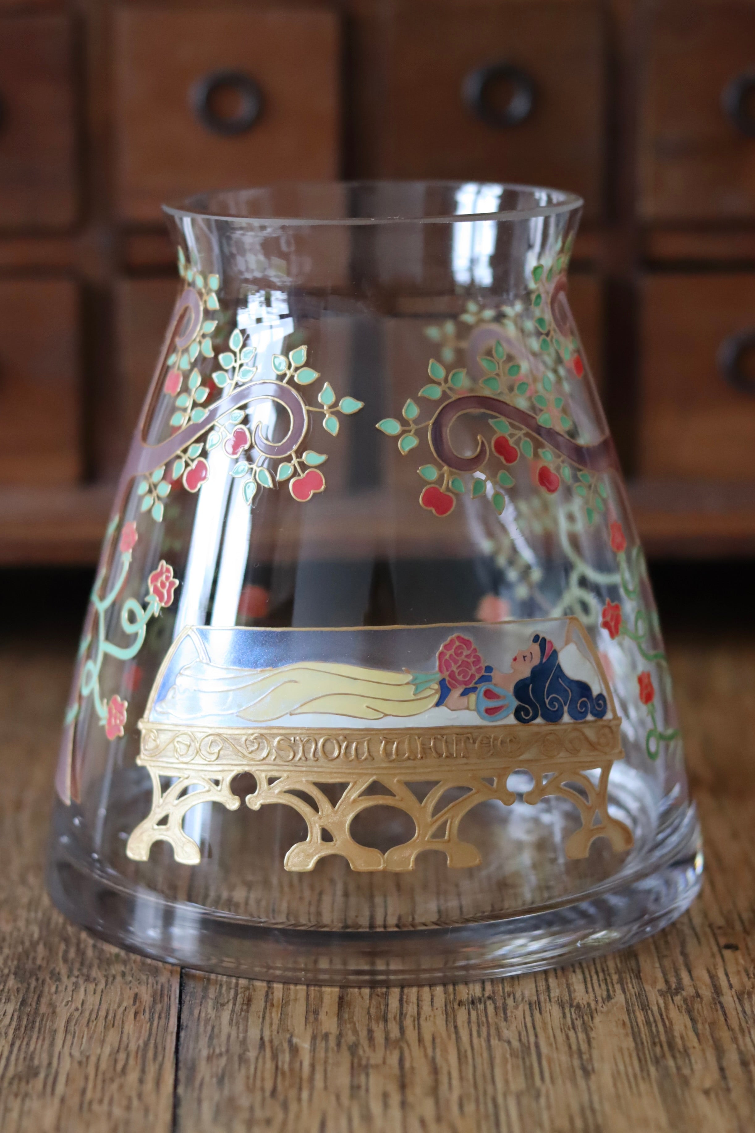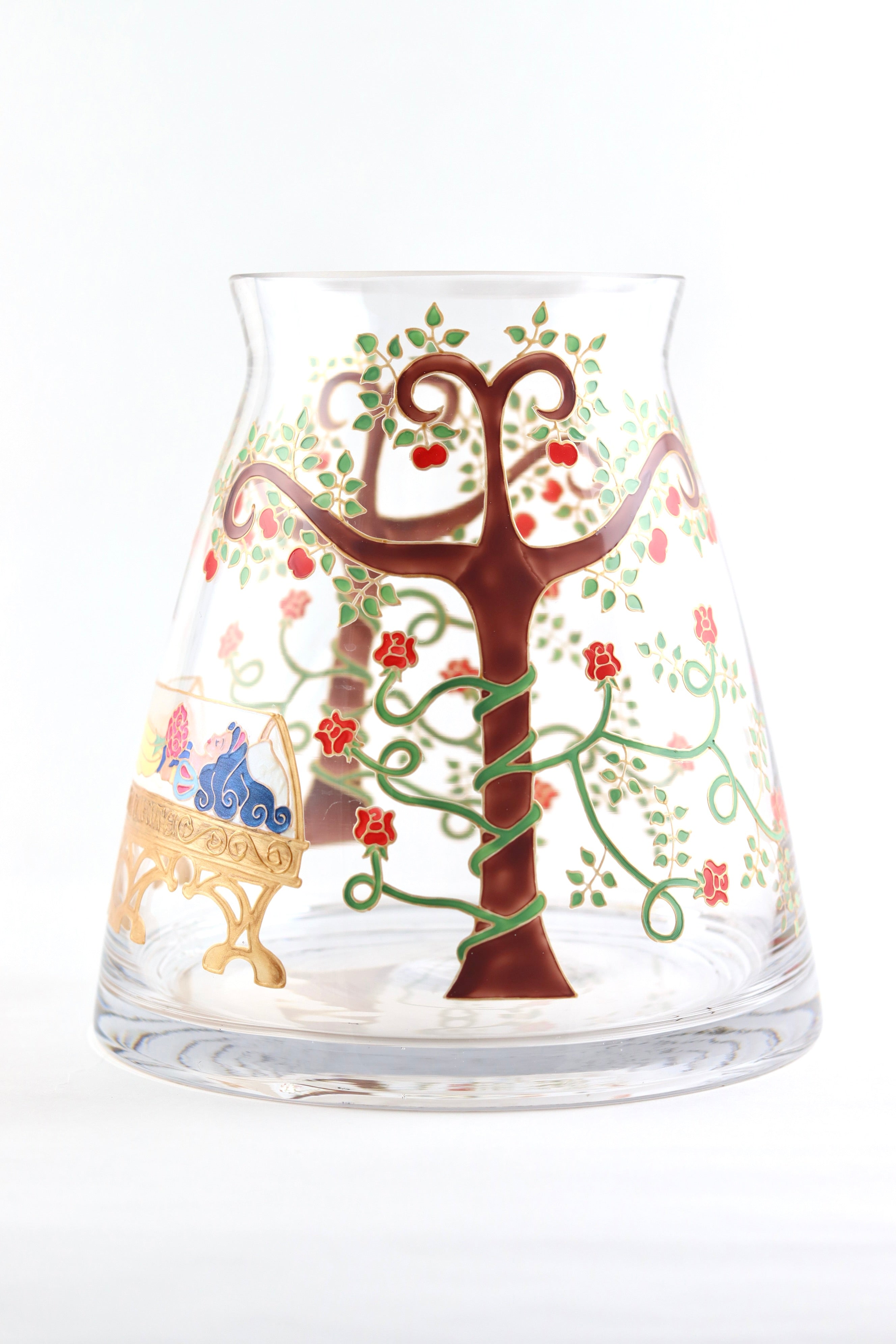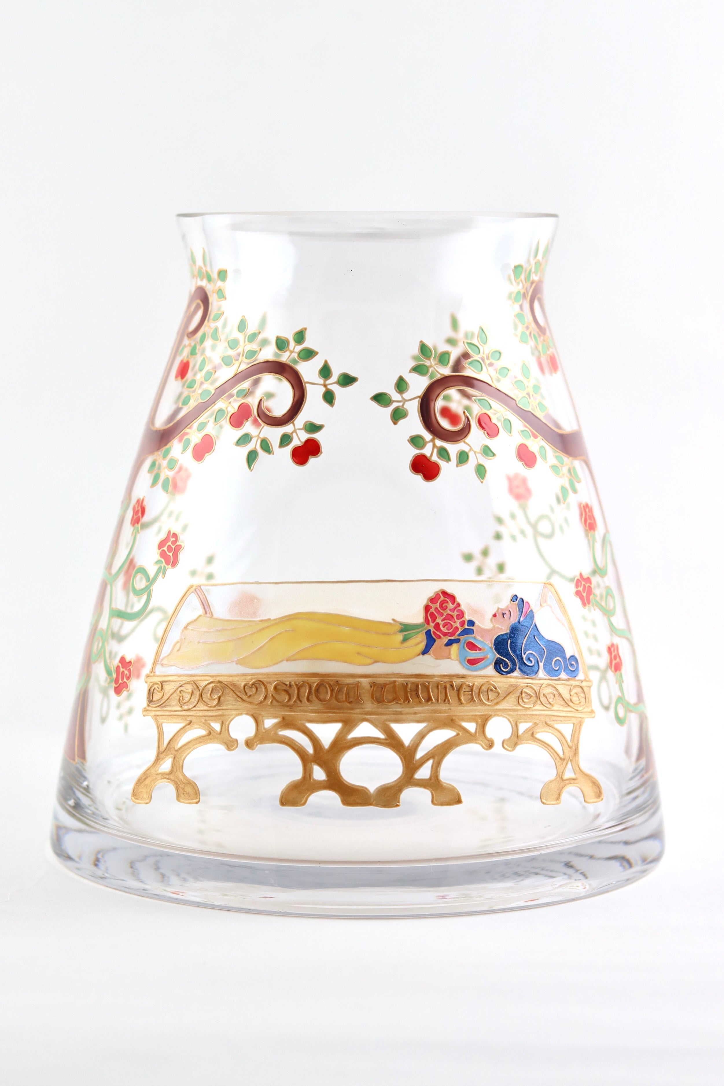 This vase is hand painted with a design, inspired by the fairytale of Snow White and features the sleeping princess, in her glass coffin, surrounded by rose vines and apple trees.